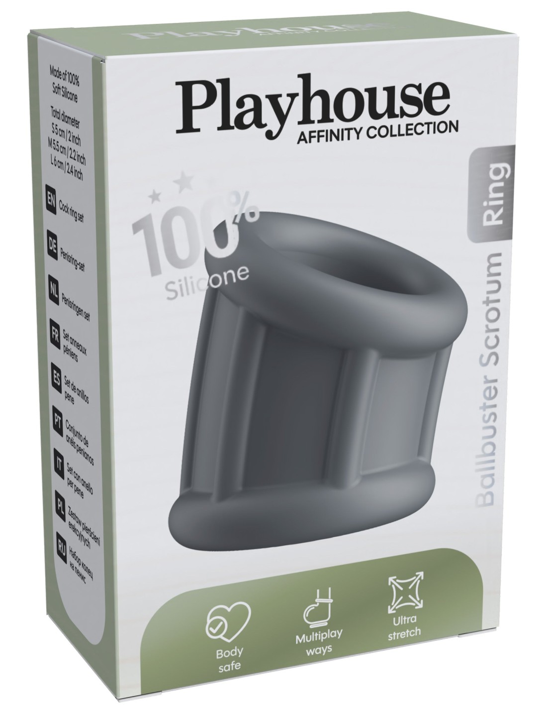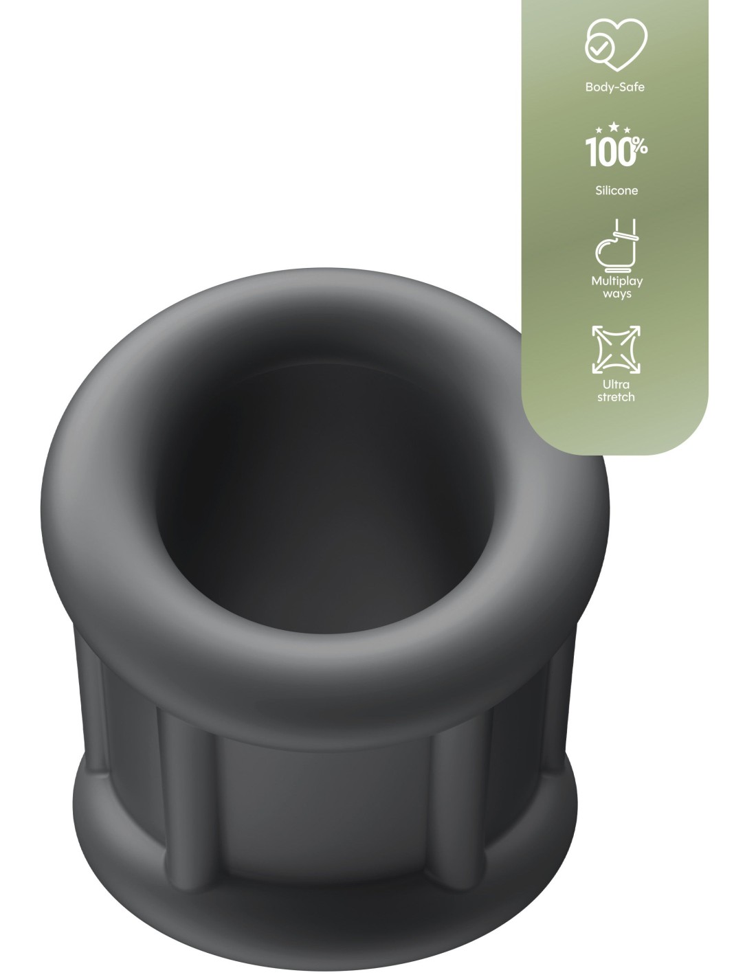 Forme légèrement inclinée avec une hauteur de 5.5 cm.Placement simple au-dessus des bourses. Avec une structure étirable.Diamètre intérieur de 35 mm.En silicone.