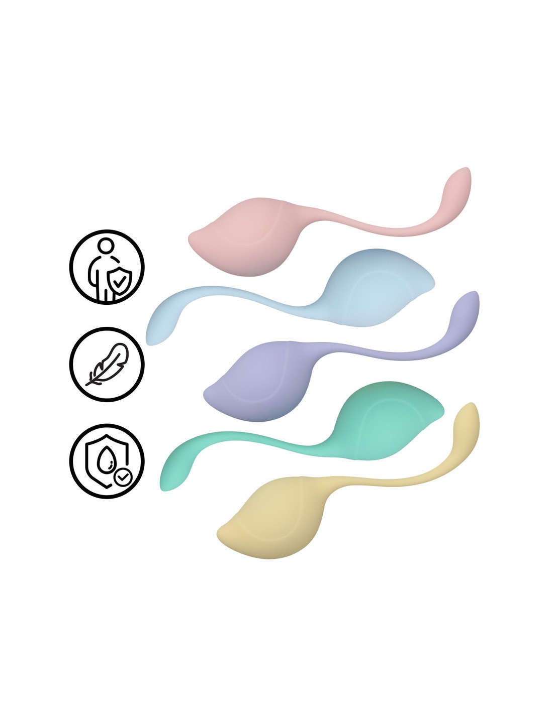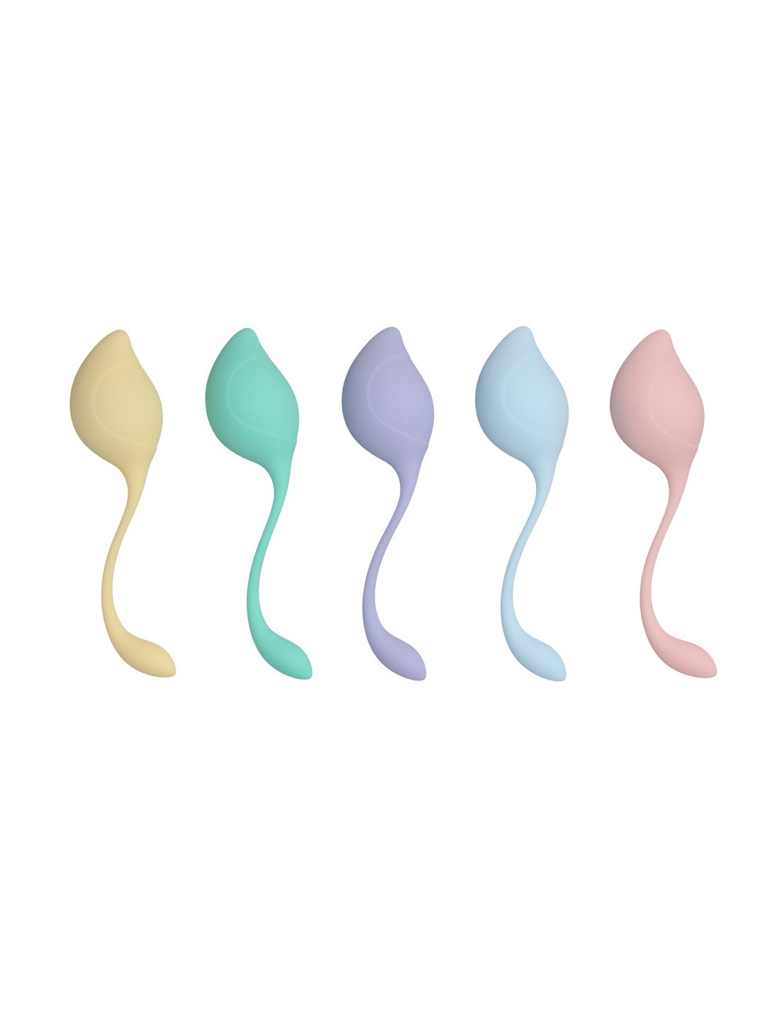 Kit de 5 boules à la forme de goutte.Longueur insérable de 5.5 cm et largeur de 2.8 à 3.5 cm.rose : 42 grammesbleue : 50 grammes violette : 58 grammesverte : 78 grammesjaune : 116 grammesEn silicone