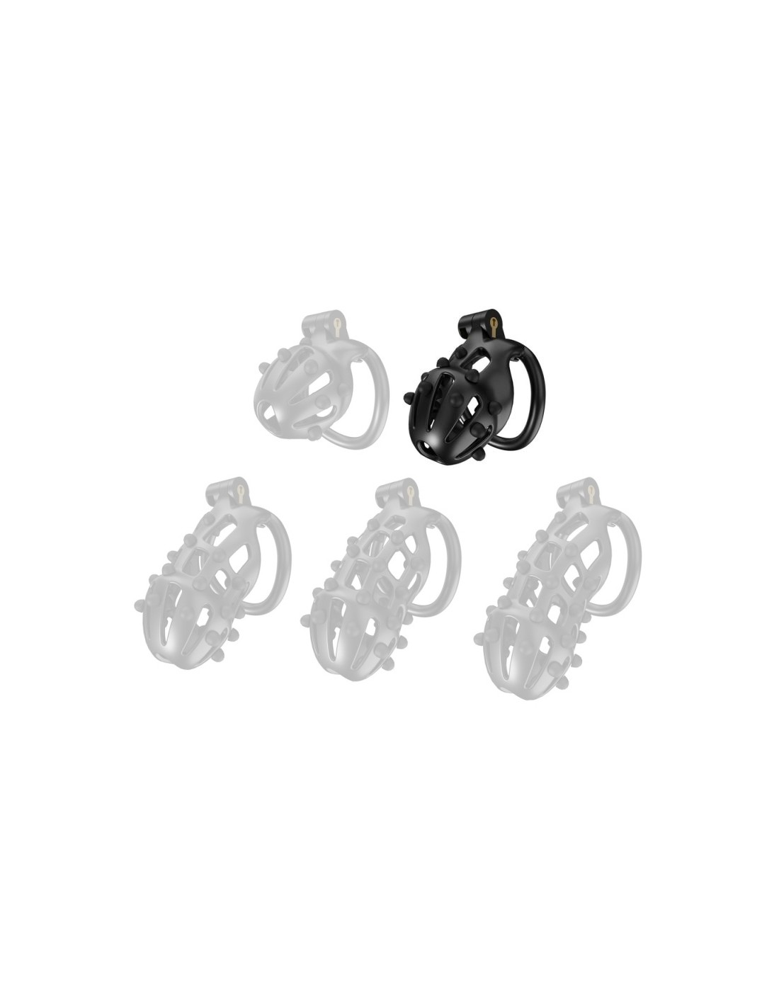 Longueur interne de 8 cm. Diamètre intérieur de 3.7 cm.Avec un surface comportant des picots amovibles (en silicone).Serrure intégrée.En plastique résine