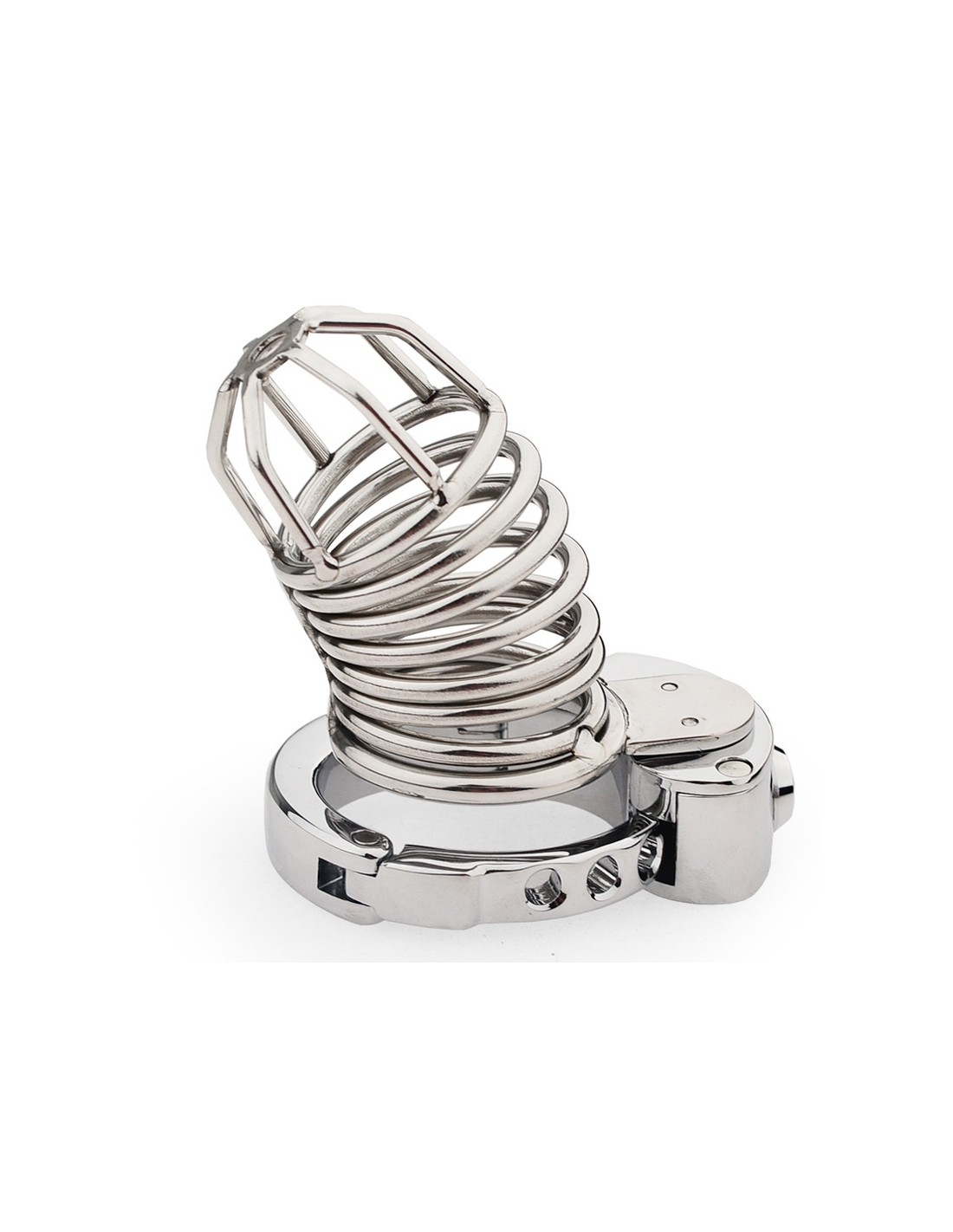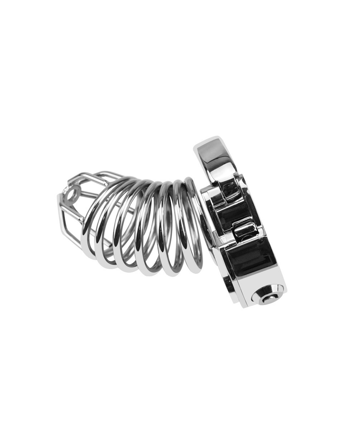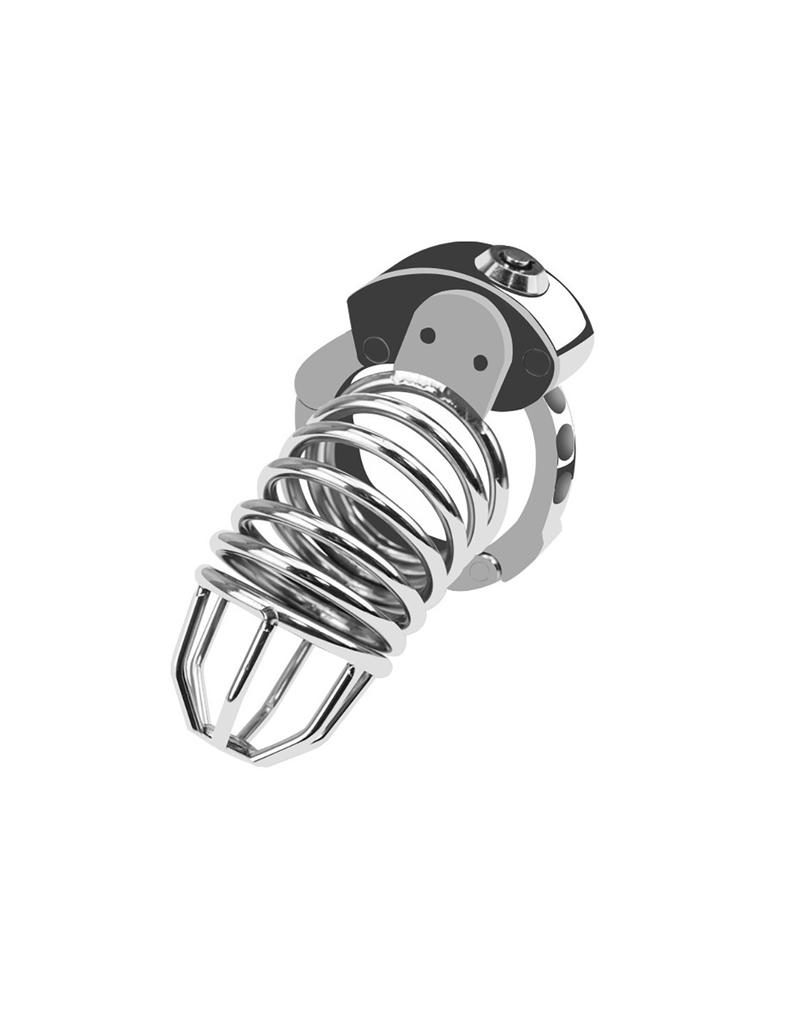Cage de chasteté d'une longueur intérieure de 9 cm et d'un diamètre interne de 35 mm. L'anneau est ajustable de 40 à 50 mm. Système de verrouillage intégré et 2 clés. En métal, poids de 292 grammes.