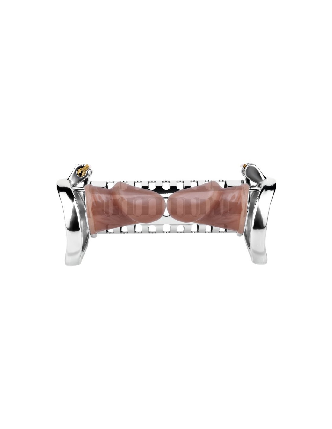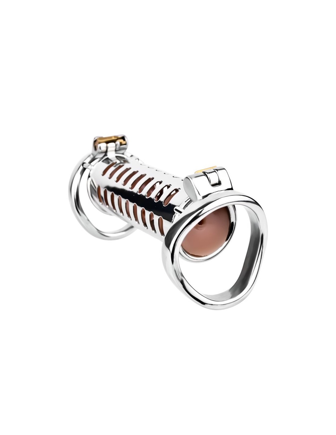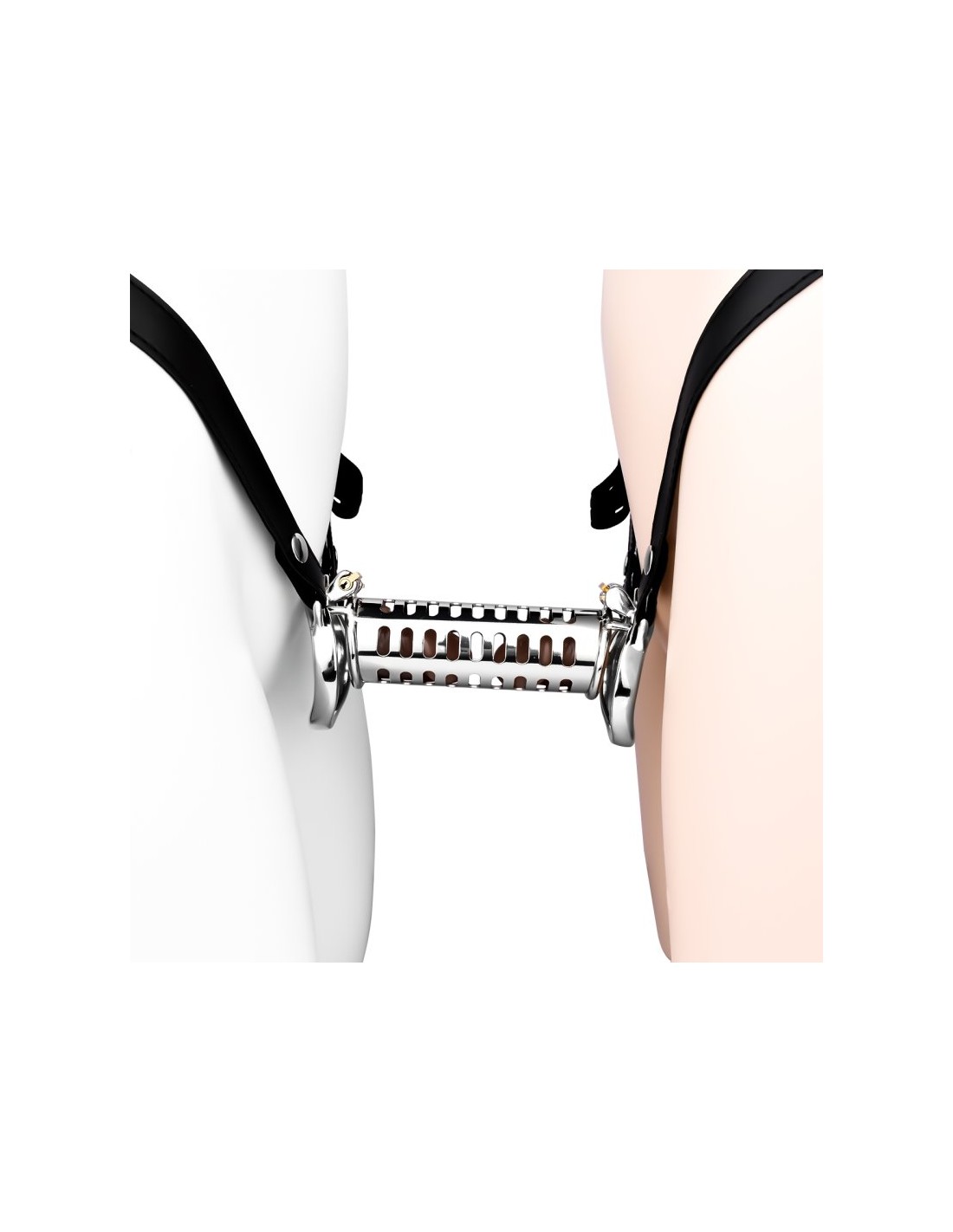 Cylindre central de 15 cm pour accueillir deux pénis.Diamètre intérieur de 37 mm.Avec deux anneaux de maintien et deux paires de clés.Lanières son fournies.En métal inox.