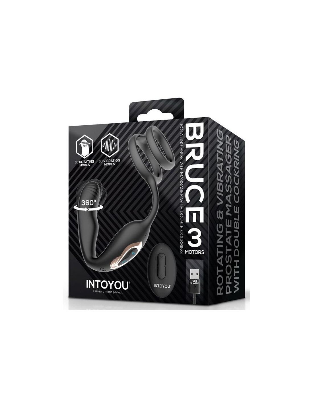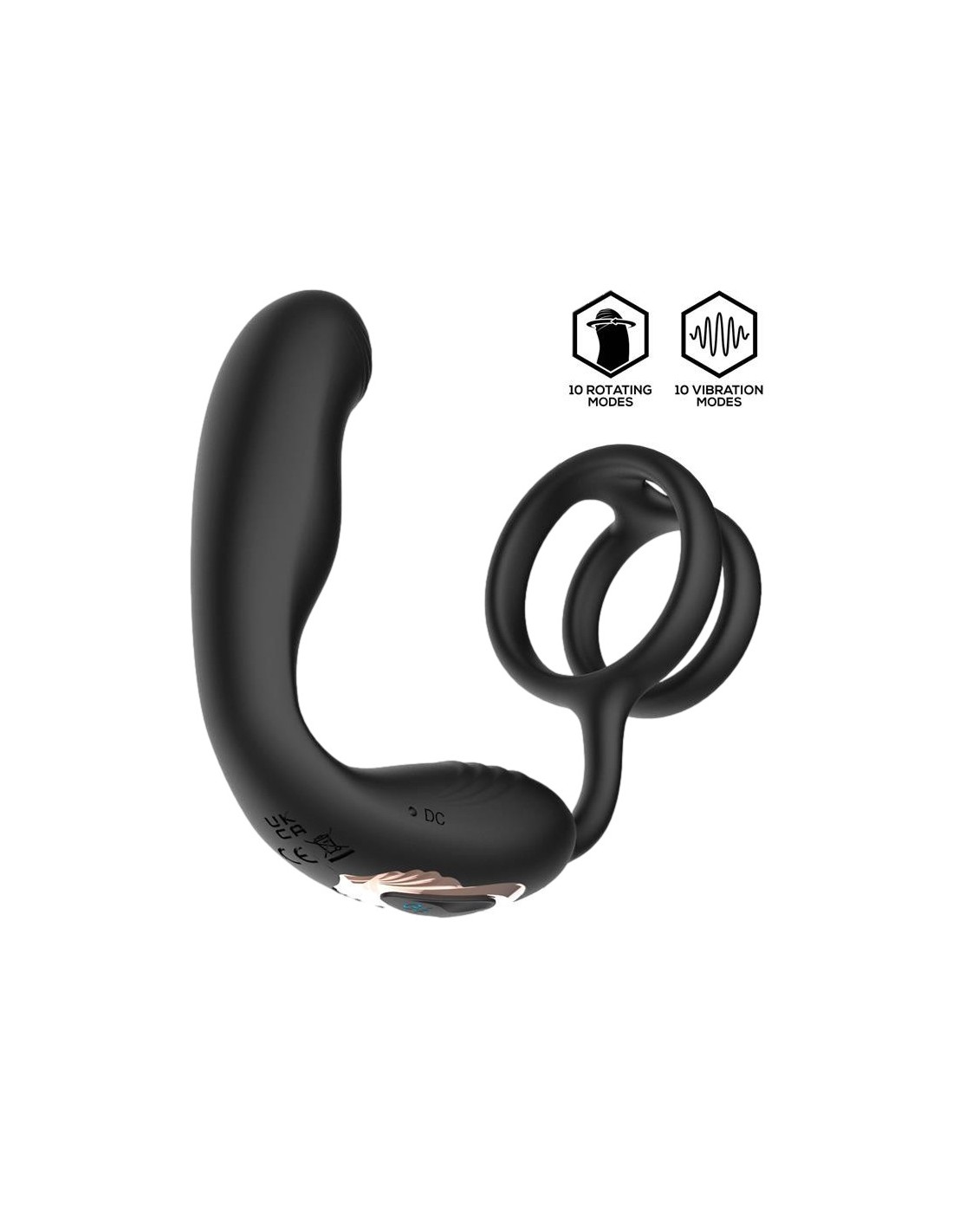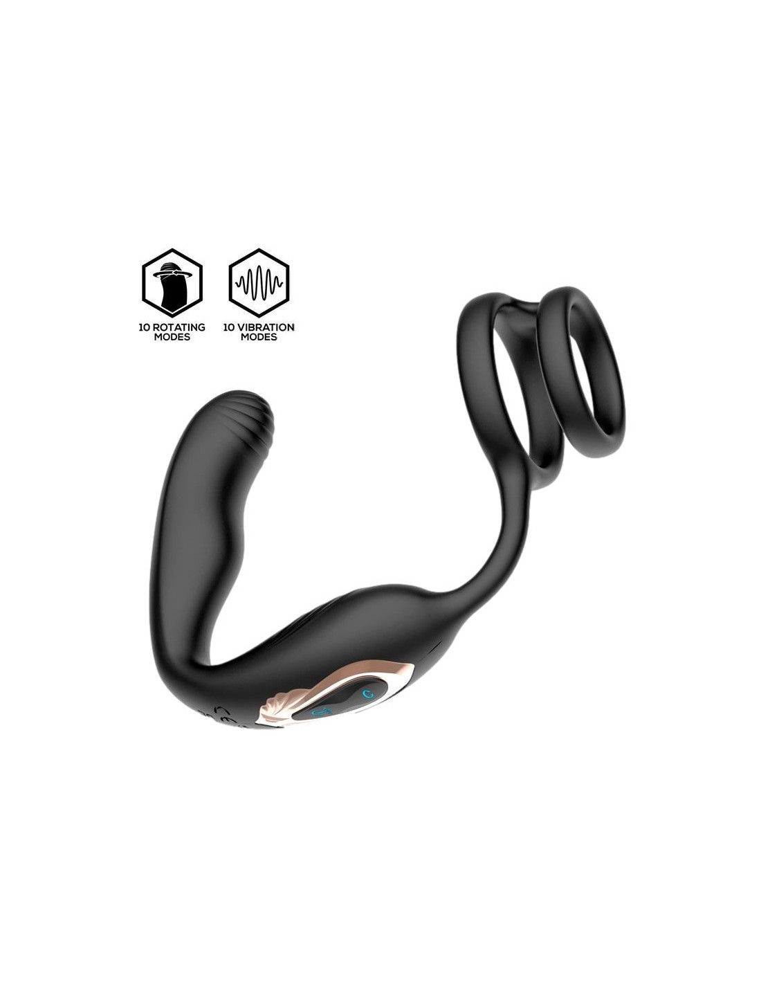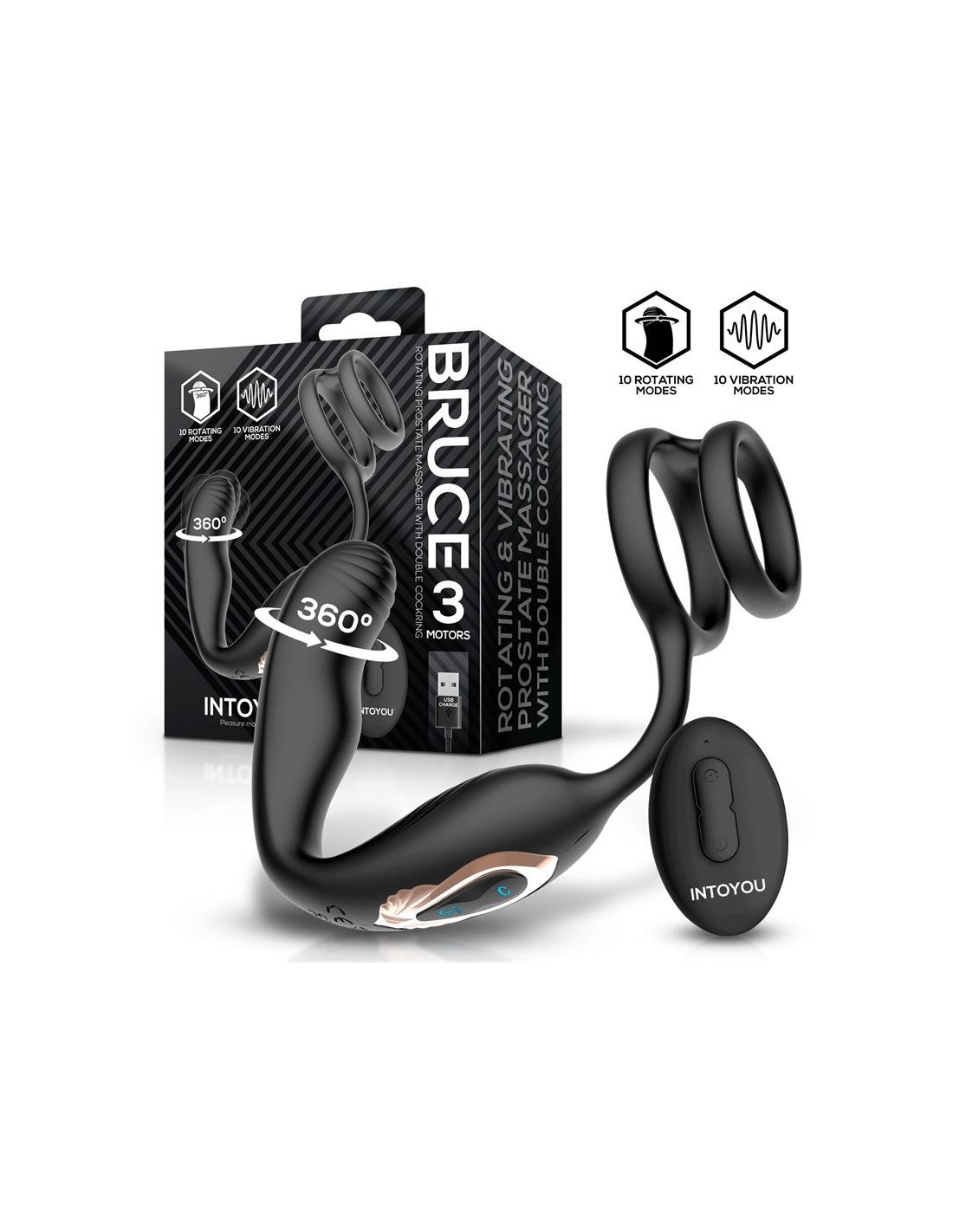 INTOYOULongueur insérable de 8.5 cm et largeur maximale de 2.6 cmAvec 10 modes de vibrations et 10 modes rotation à l'extrémité.Double anneau pour placer sur le sexe.En silicone.USB.
