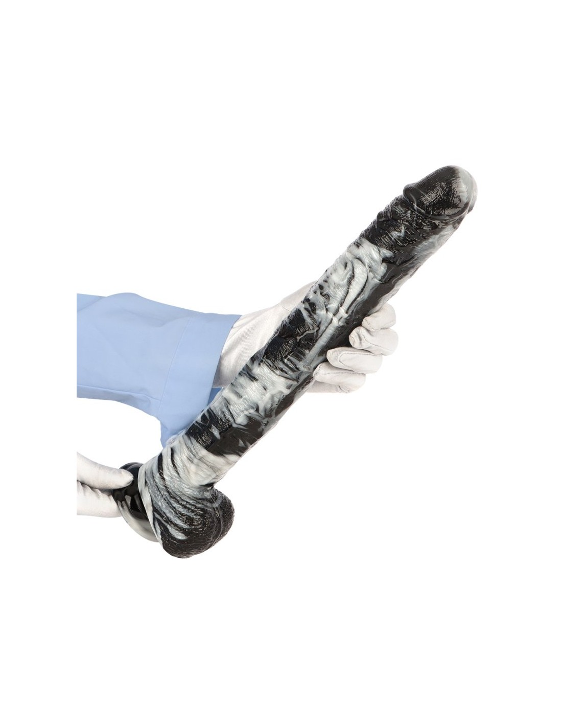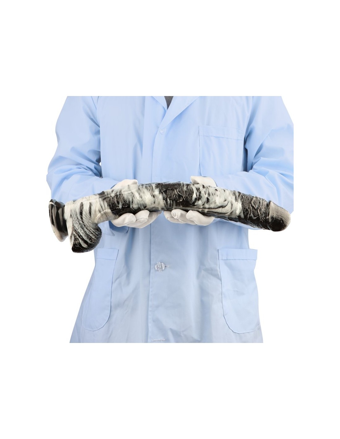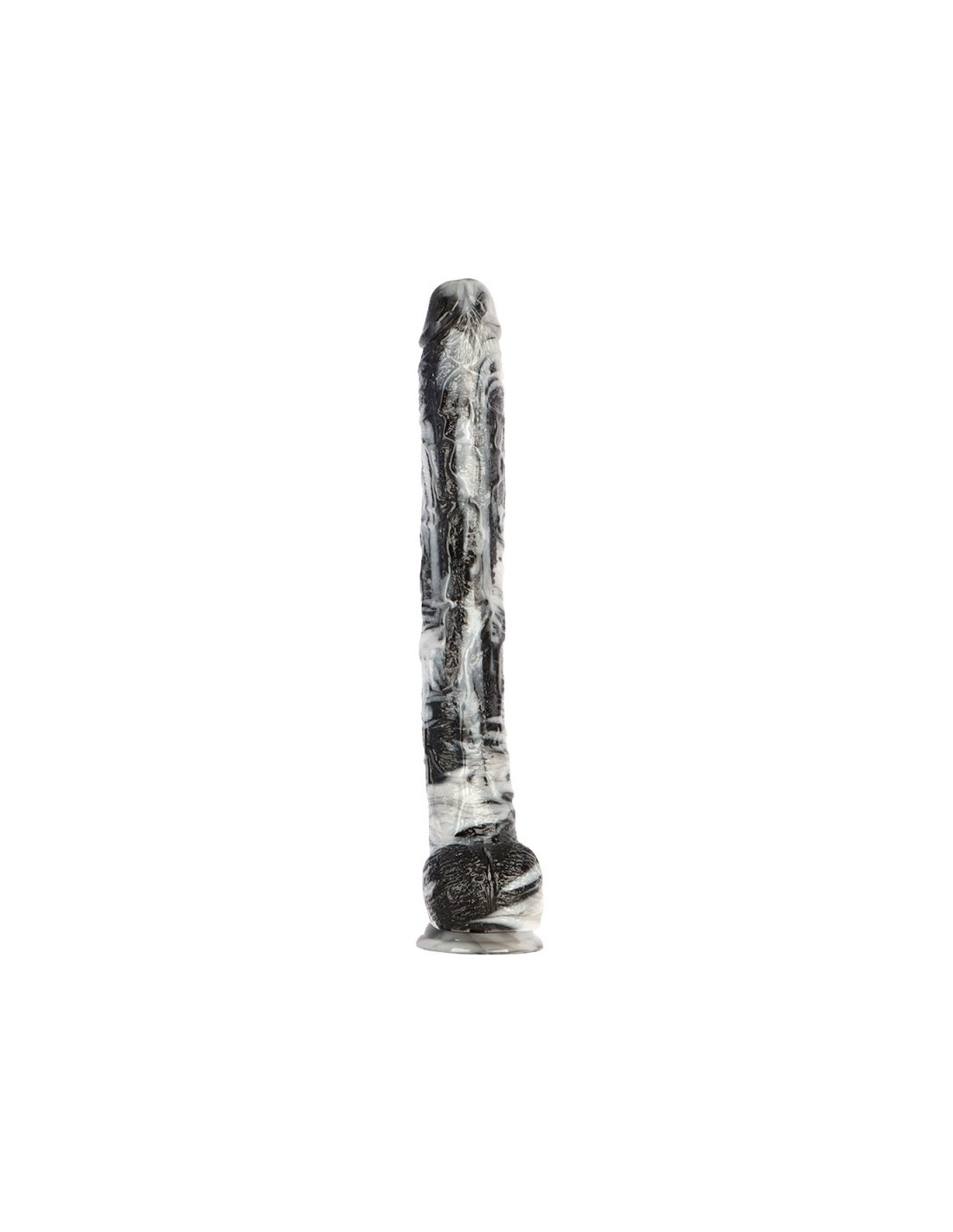 Gode XL, avec gland décalotté, bourses rondes et surface veinée. Longueur insérable de 35.5 cm et largeur de 4.8 à 5.3 cm. surface veinée En PVC, avec base ventouse.
