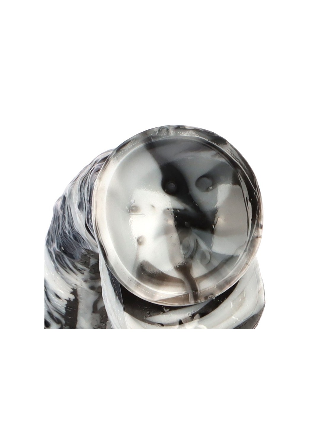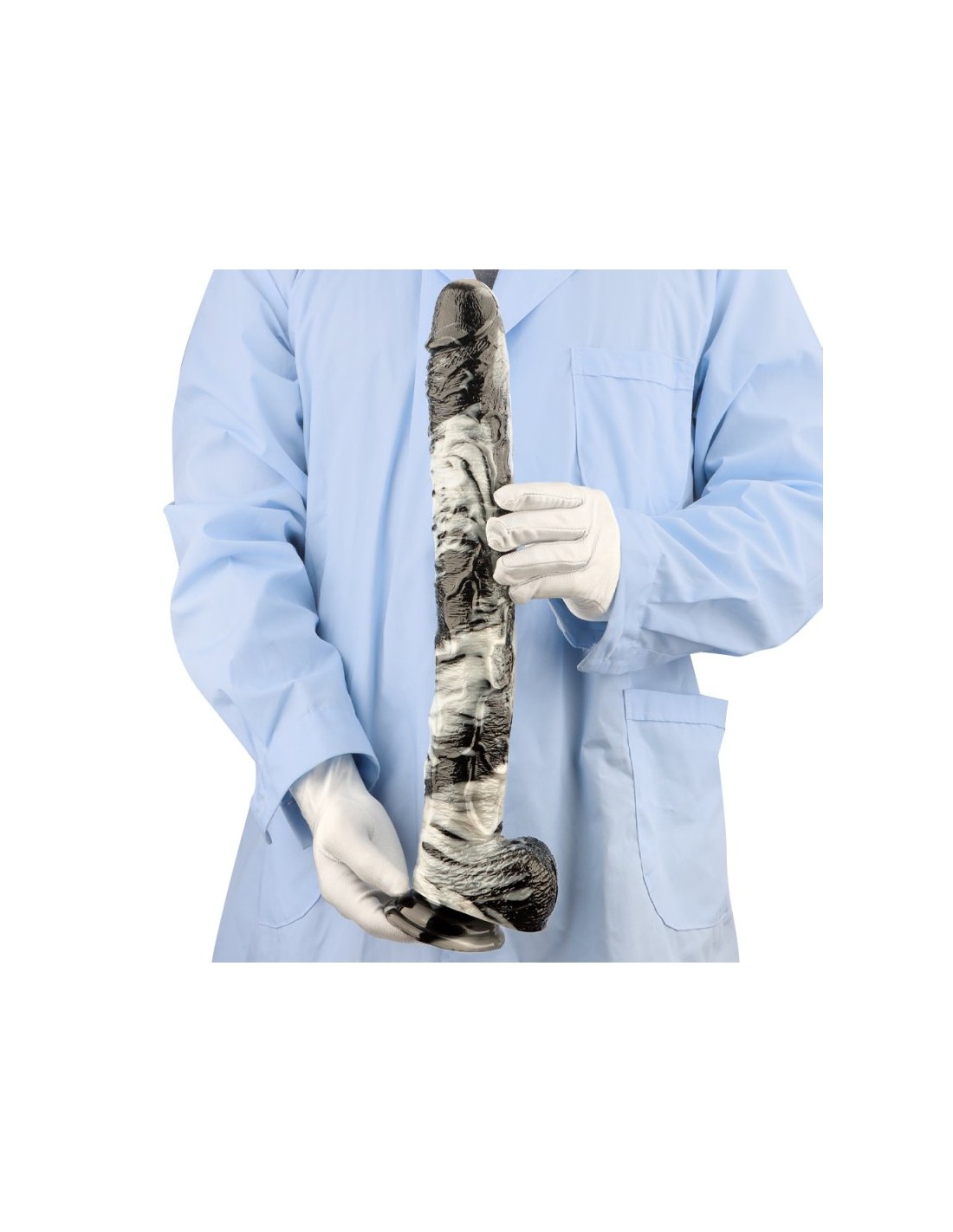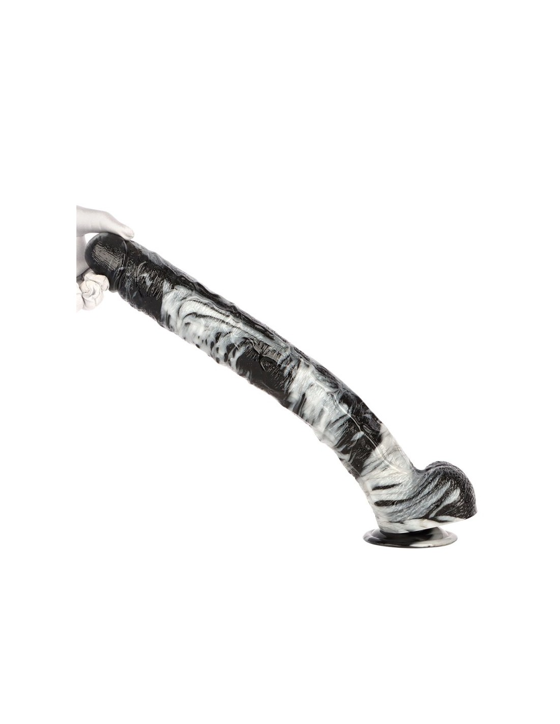 Gode XL, avec gland décalotté, bourses rondes et surface veinée. Longueur insérable de 35.5 cm et largeur de 4.8 à 5.3 cm. surface veinée En PVC, avec base ventouse.