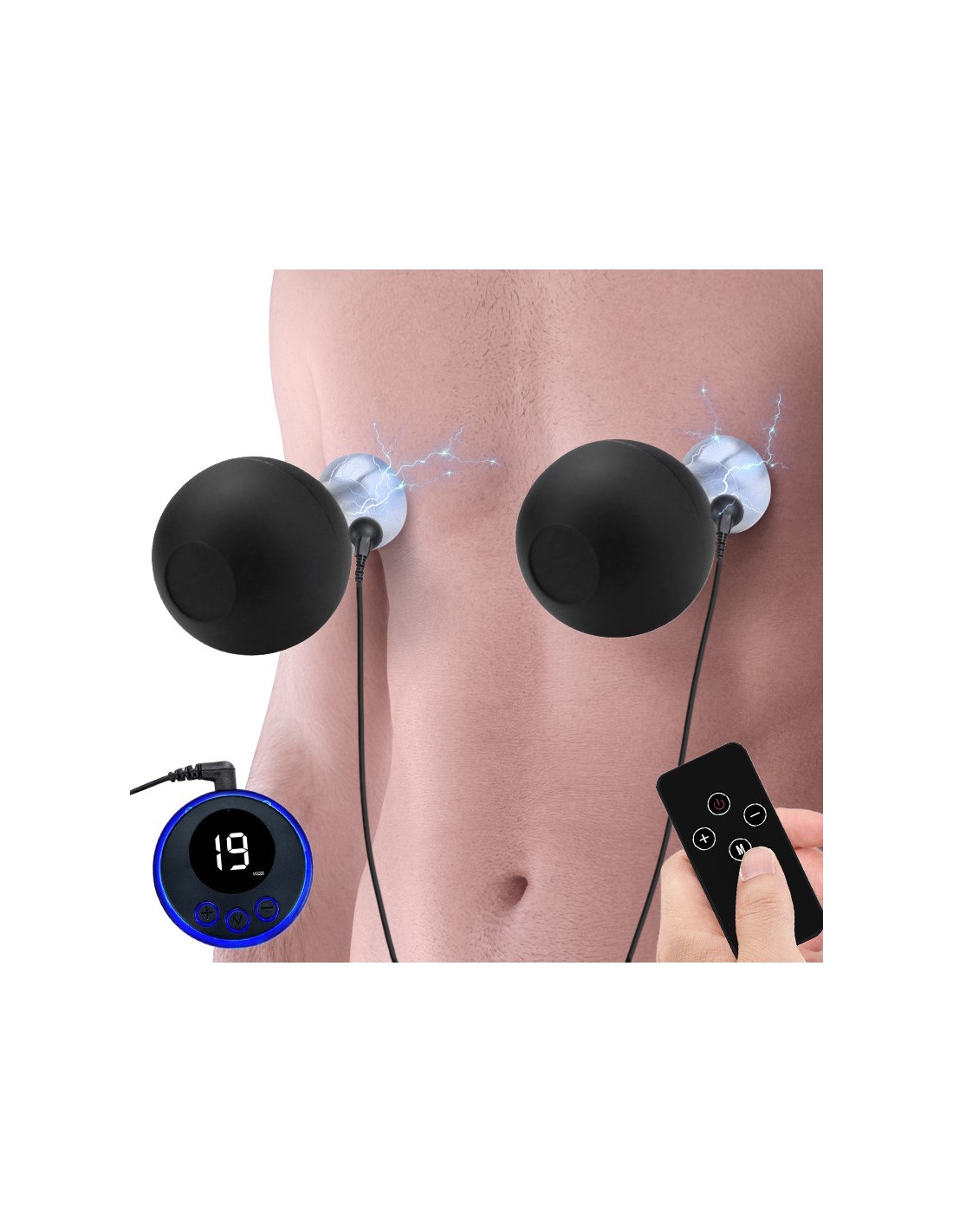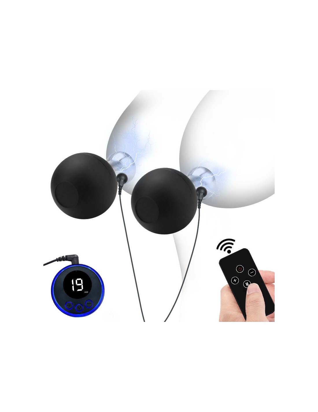 Suce-tétons avec câbles et commandes d'électrostimulation. 10 impulsions et télécommande sans fil.Partie noire en silicone, partie grise en métal.Rechargeable.