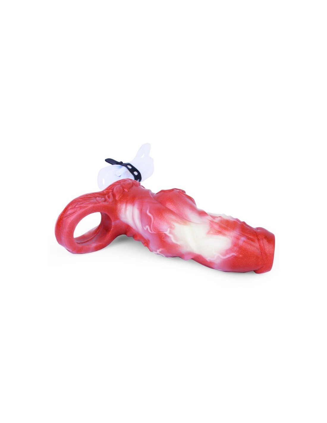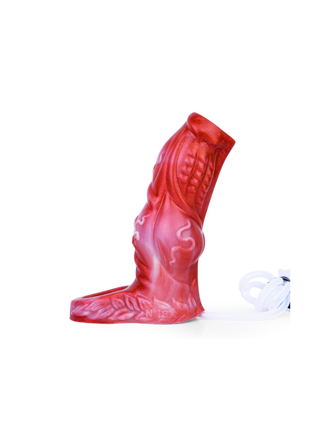 Longueur de 11 cm pour passer le pénis. Extrémité coupée.Largeur maximale de 5.5 cm.Surface texturée et forme insolite.Avec seringue et poire pour qu'il projette un liquide.En silicone.