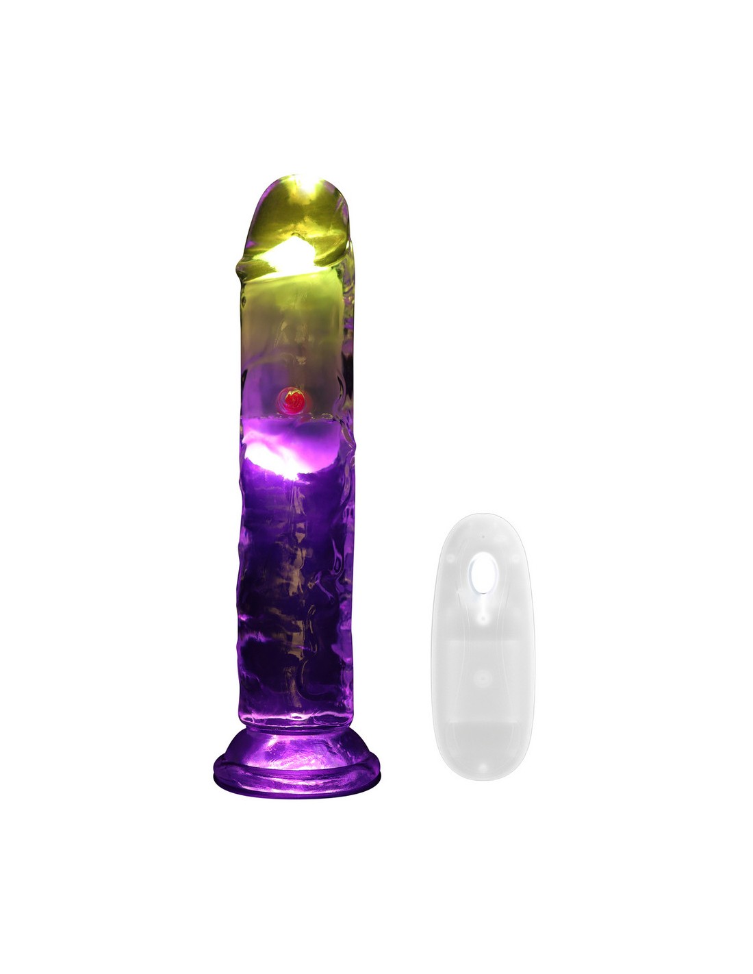 Real Rock CrystalGode vibrant avec gland décalotté et surface texturée.Longueur insérable de 18 cm et largeur de 3.8 à 4 cm.10 modes de vibrations, avec couleurs variables.En TPE, étanche et rechargeable, avec base ventouse.