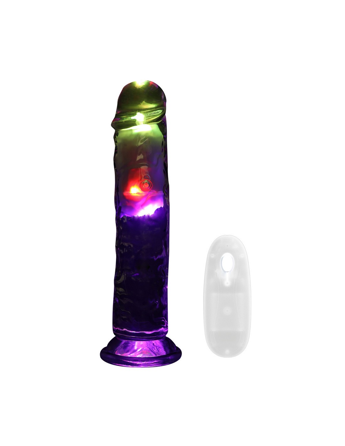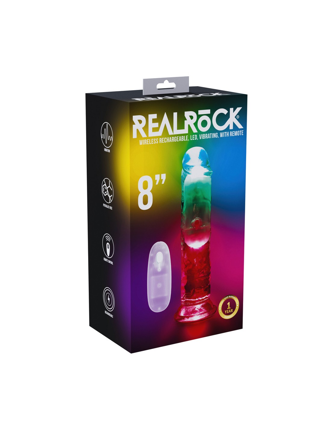 Real Rock CrystalGode vibrant avec gland décalotté et surface texturée.Longueur insérable de 20 cm et largeur de 4.2 à 4.4 cm.10 modes de vibrations synchronisés aux leds multicolores.En TPE, étanche et rechargeable, avec base ventouse.