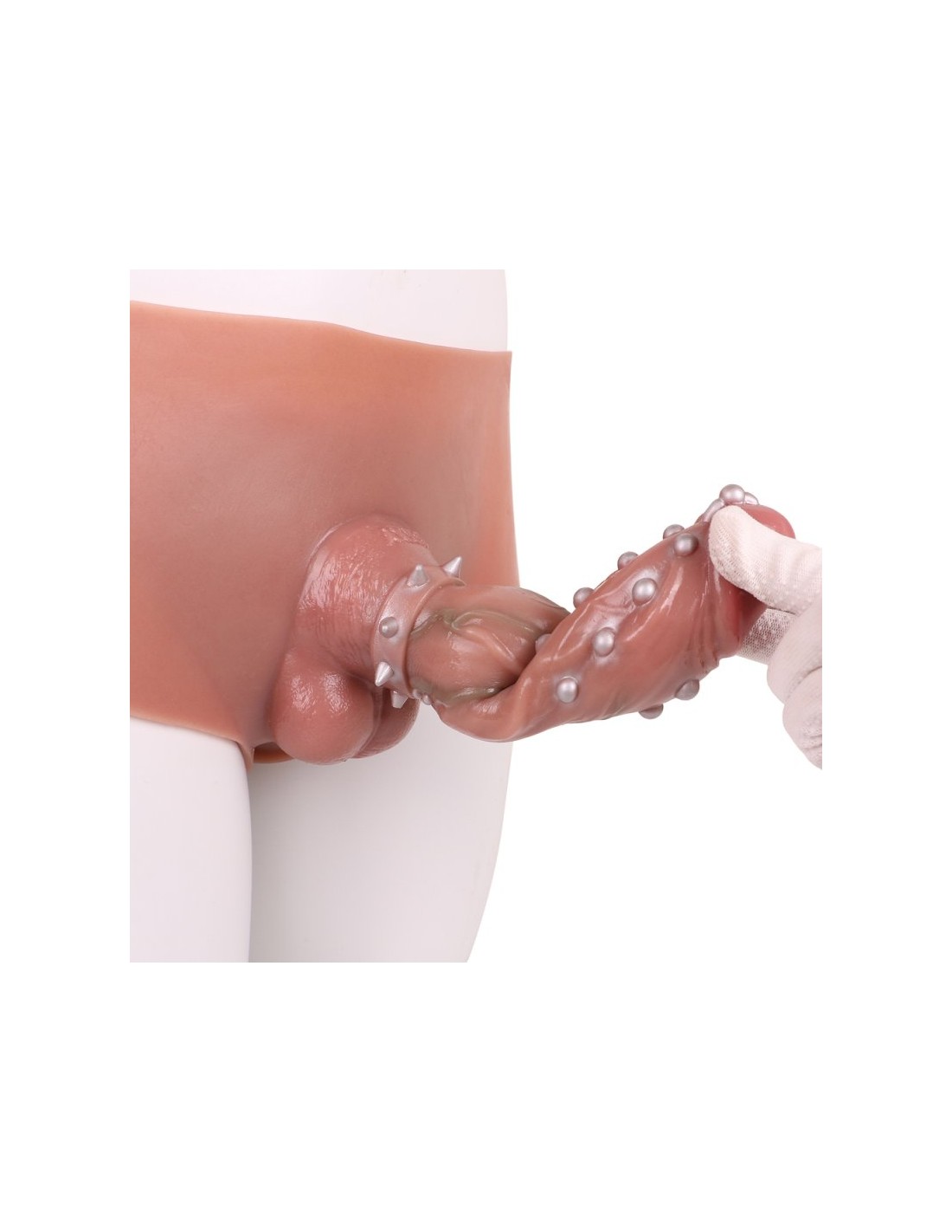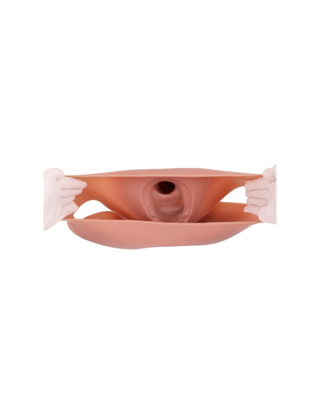 Gode ceinture creux avec gland décalotté, surface texturée, piercings et cockring.Longueur insérable de 16 cm et largeur de 4.5 à 5.5 cm.Gaine de 13 cm de long et largeur de 2.5 cm.En silicone, tour de taille de 72 cm.