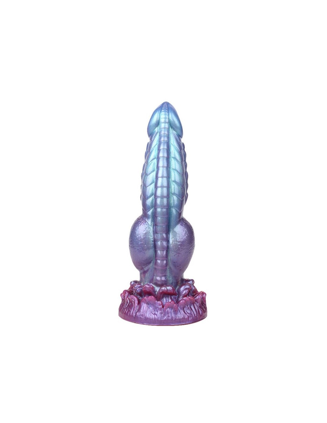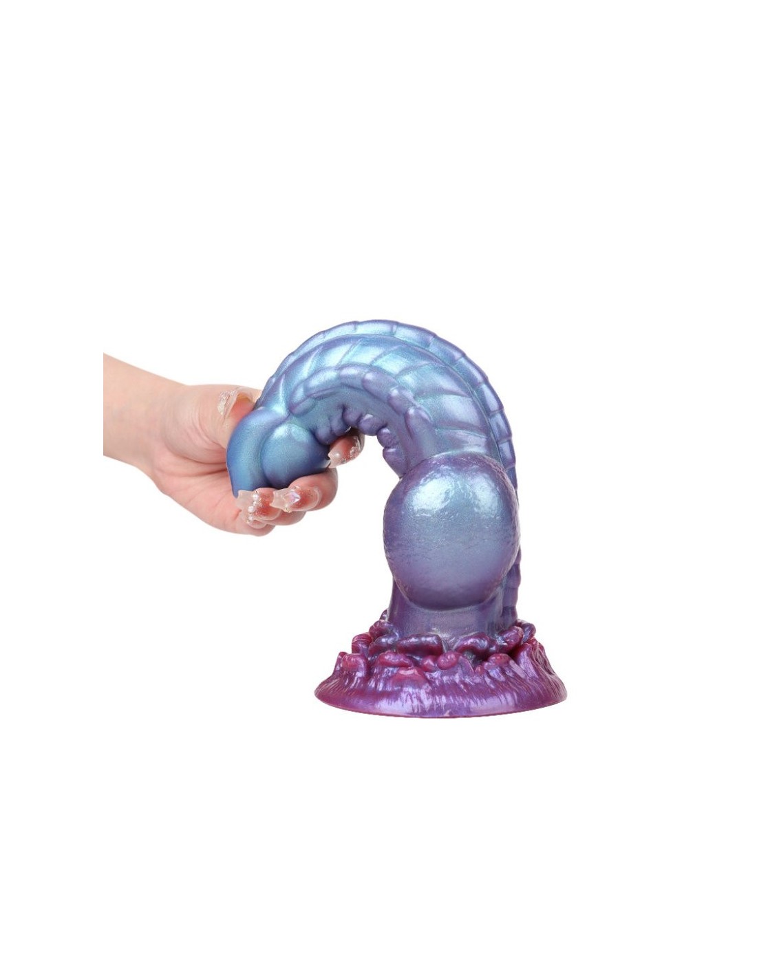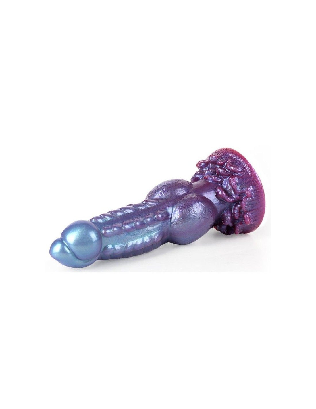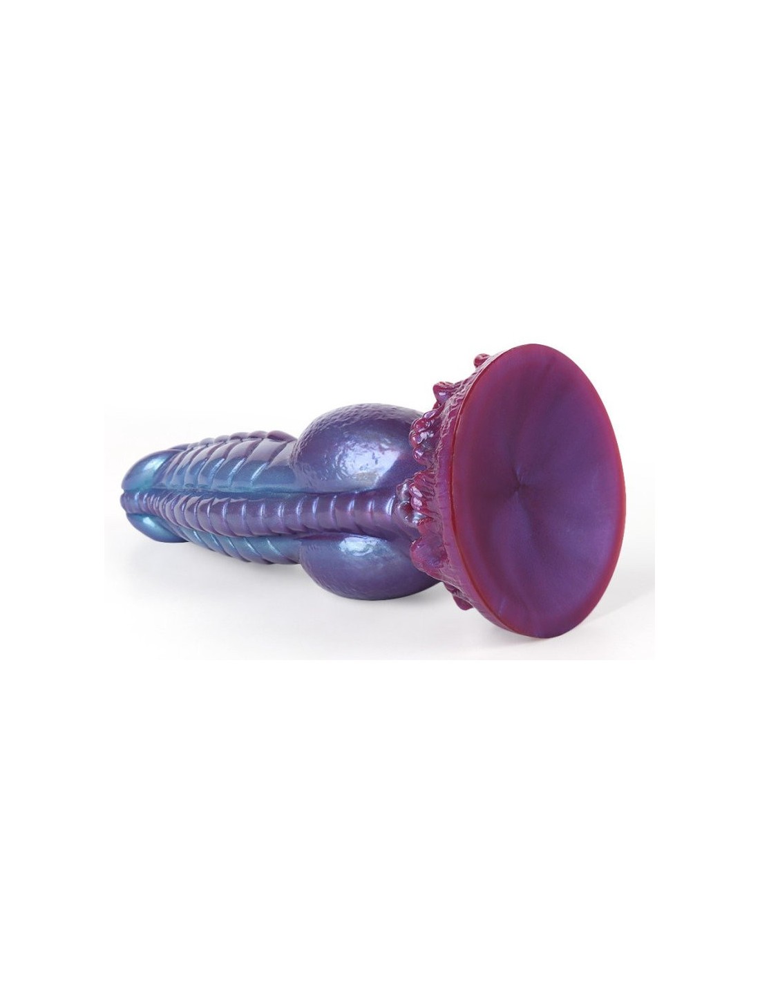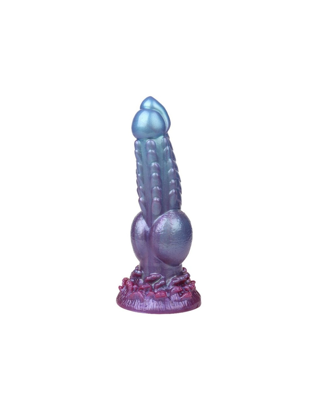 Gode avec un gland en deux parties et un corps aux multiples reliefs.Longueur insérable de 18 cm et largeur de 3.5 à 6.5 cm.En silicone, avec base ventouse