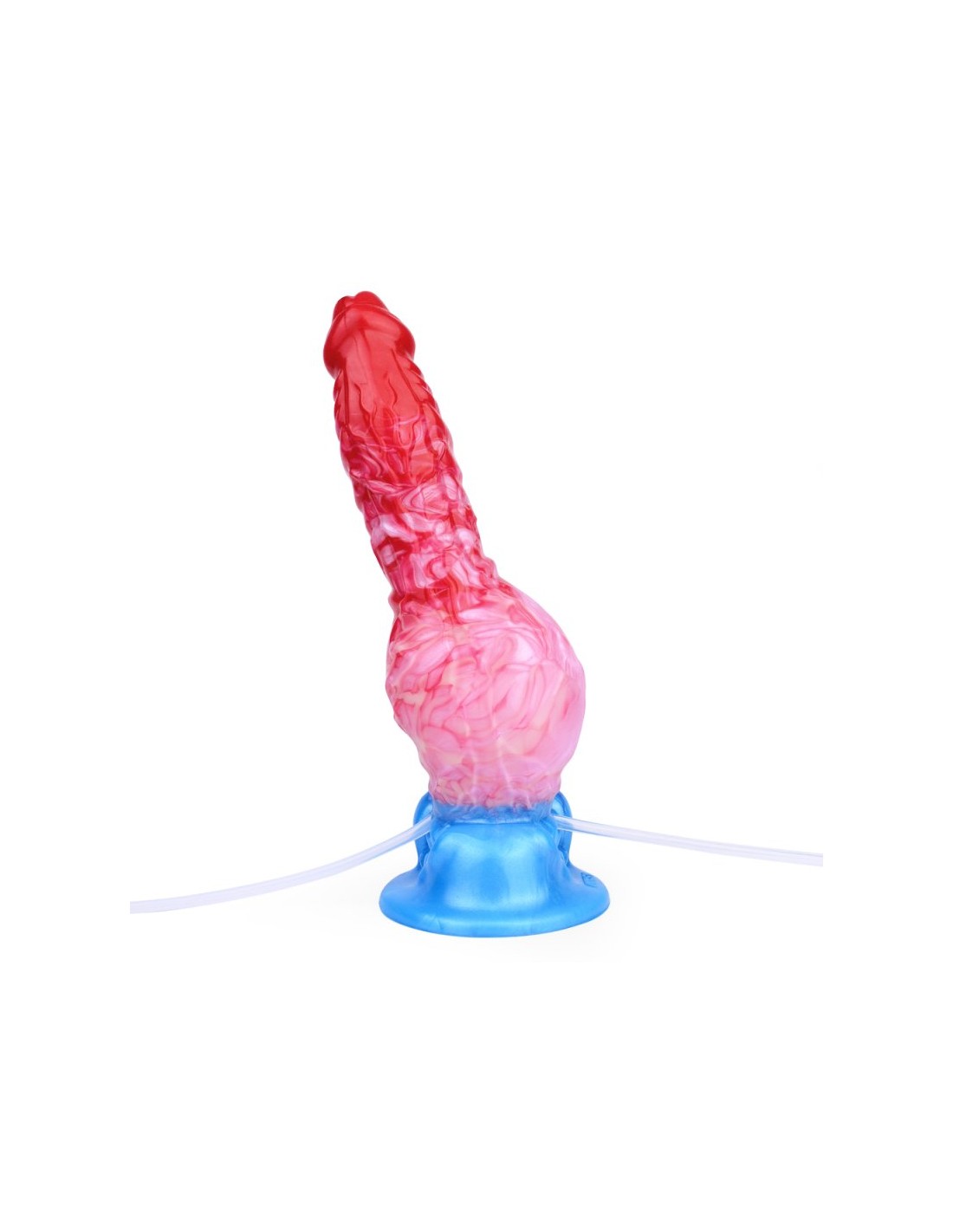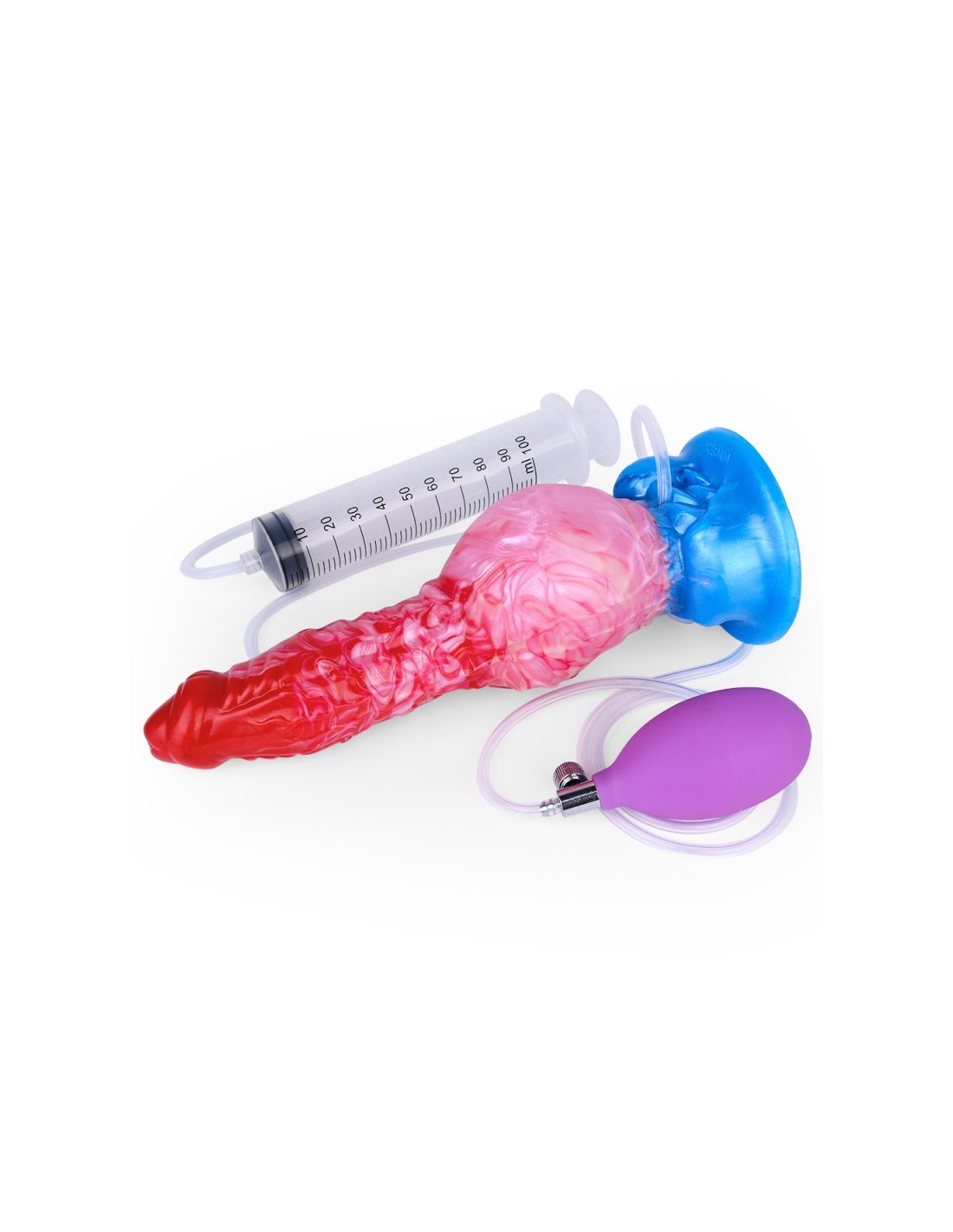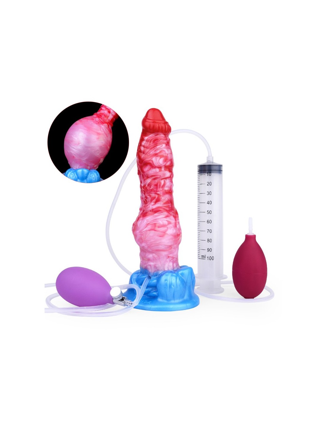 Gode éjaculateur et gonflable de 6 à 9 cm. Longueur insérable de 18 cm.Seringue de 100 ml et poire pour la projectionEn silicone rose et blanc, avec base ventouse bleue.