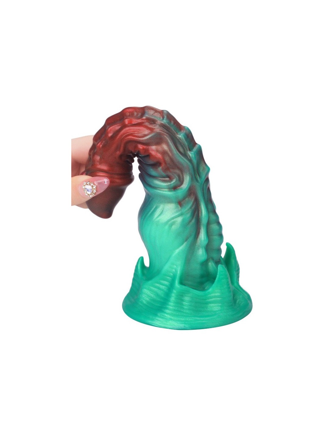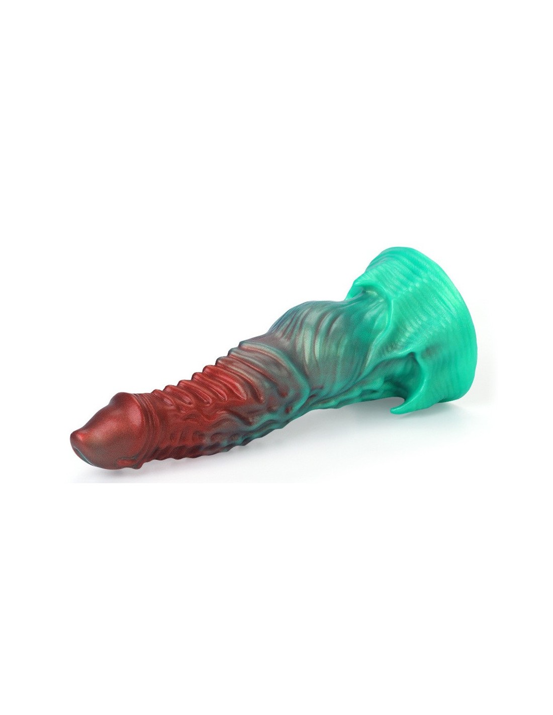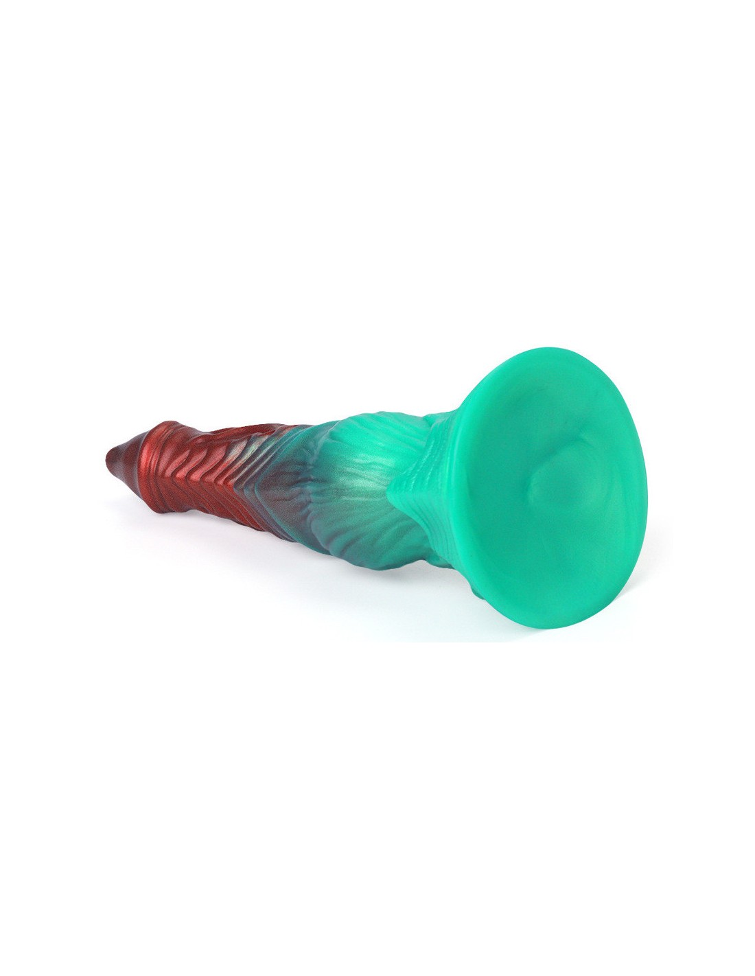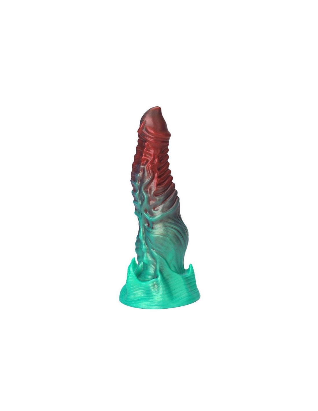 Gode à la forme atypique, avec gland en pointe et surface texturéeLongueur insérable de 17 cm et largeur de 3.5 à 5.5 cm.En silicone, avec base ventouse