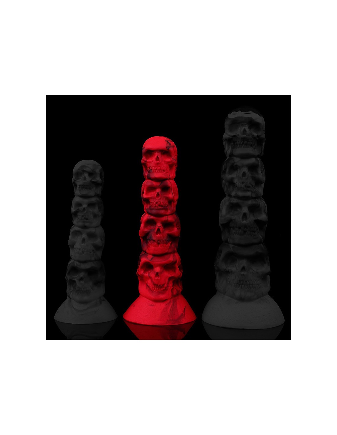 Bad DemonPlug avec 4 Têtes de mort dont les largeurs vont de 4.3 à 5.8 cm en augmentation progressive.La longueur insérable est de 18 cm.Avec une base ventouse.En silicone.