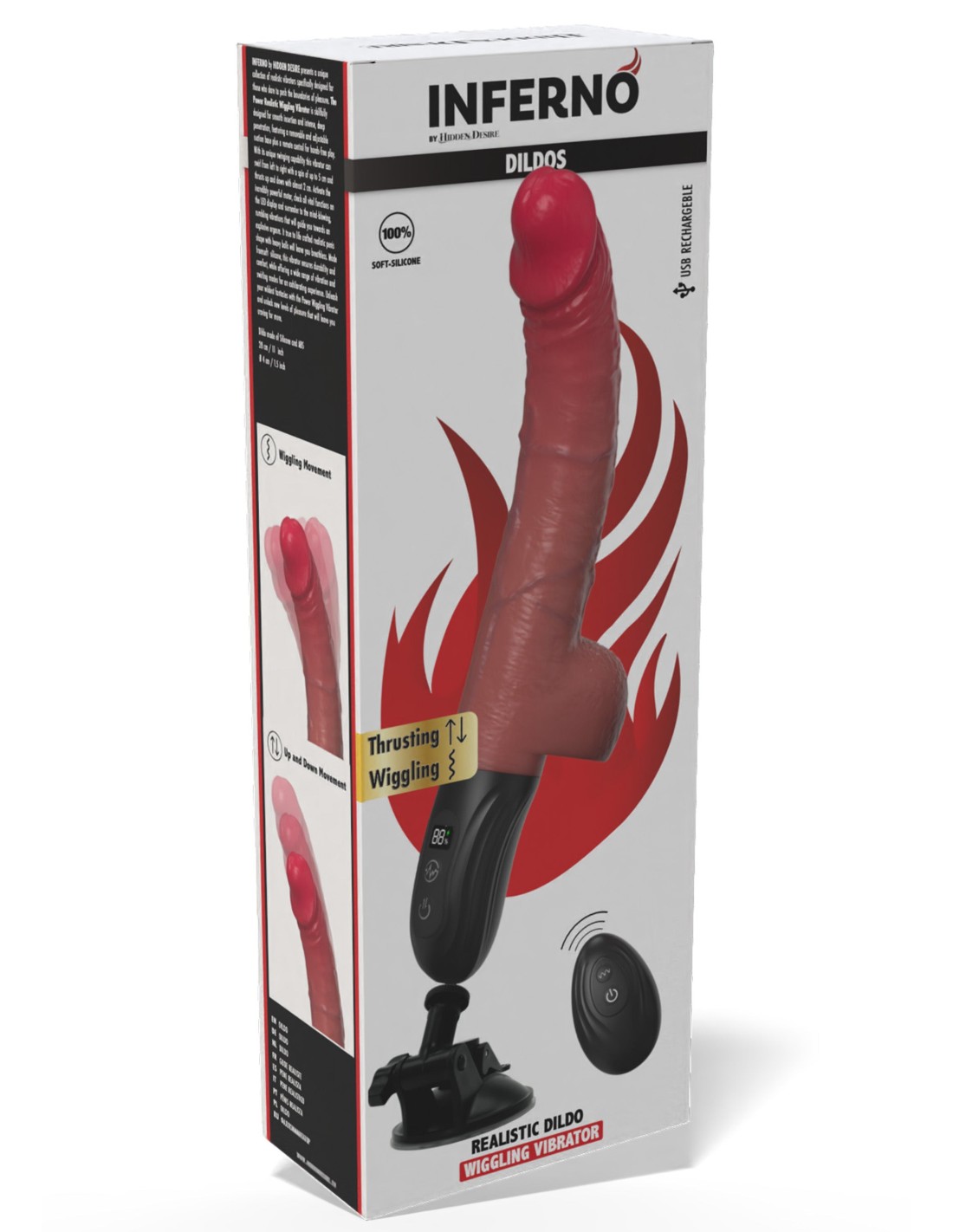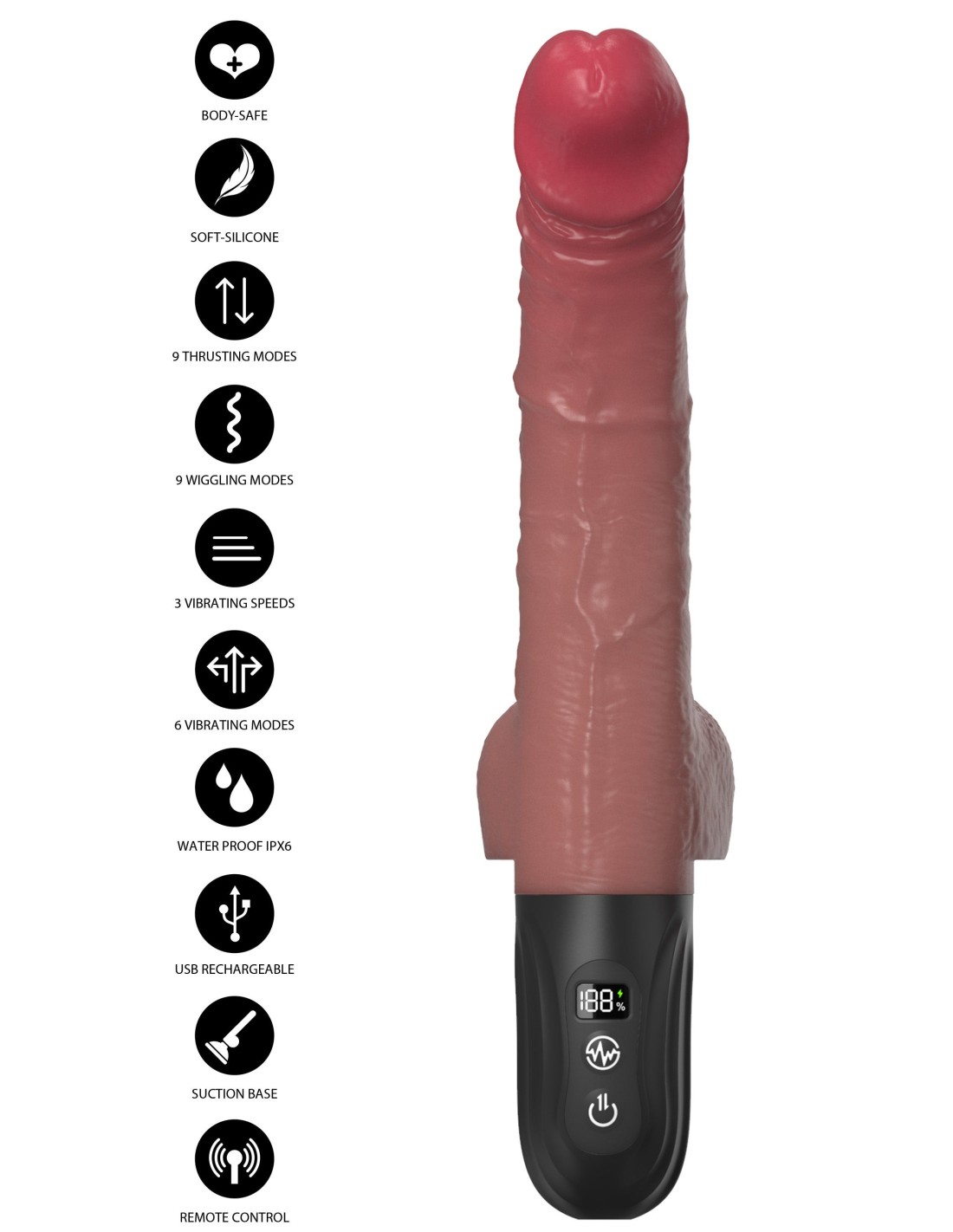 Caractéristiques :Longueur totale 26 cm (sans la base ventouse)Longueur insérable 16 à 18 cmLargeur mini 3.6cm Largeur maxi 4 cm 9 modes de va-et-vient horizontaux9 modes de vibrations et de va-et-vient verticauxRechargeable - batterie lithiumTélécommande à pile (CR2032 non fournie)Poids 365 grammes (sans la base ventouse)Conseils d'utilisation :le nettoyer avant et après chaque utilisation avec de l'eau savonneuse tiède et le laisser sécher à l'air librel'utiliser, uniquement, avec du lubrifiant à base d'eau le conserver dans un endroit sec et propre, à l'abri de la lumière et de la chaleur, sans contact avec d'autres objets