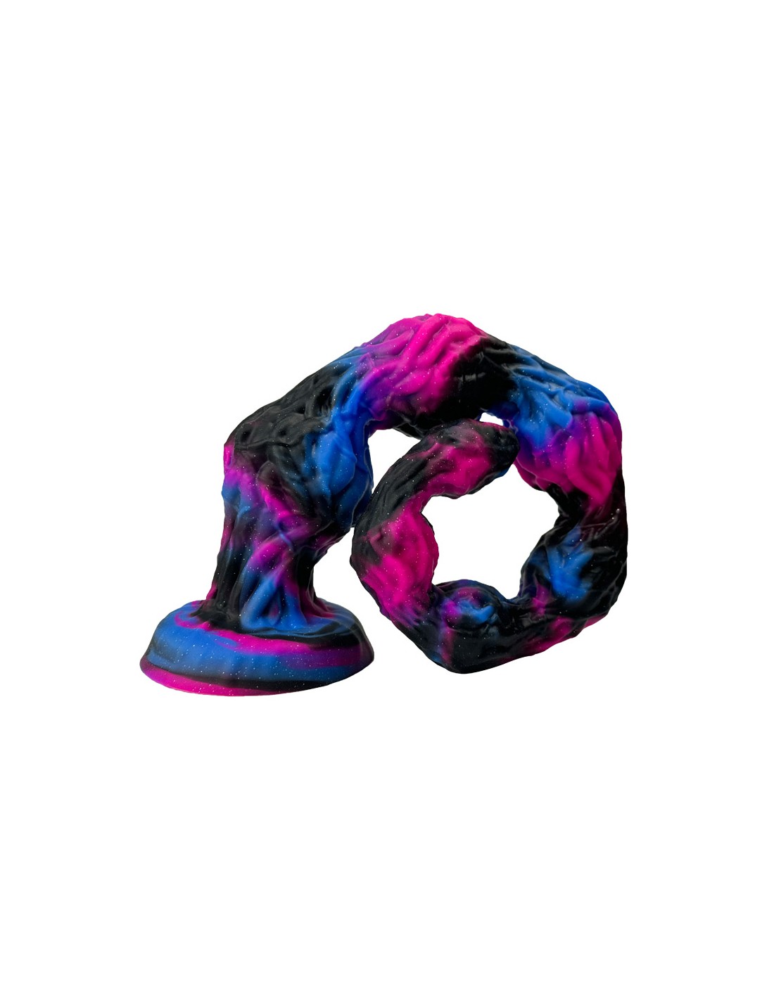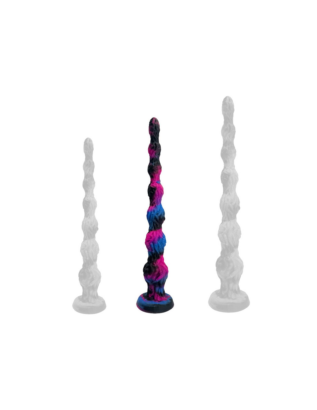 DeepleasureMélange des couleurs Rose, Bleue et Noire.Longueur insérable de 53 cm et largeur allant de 3 à 7 cm.Avec une surface texturée et une base ventouse.En silicone.
