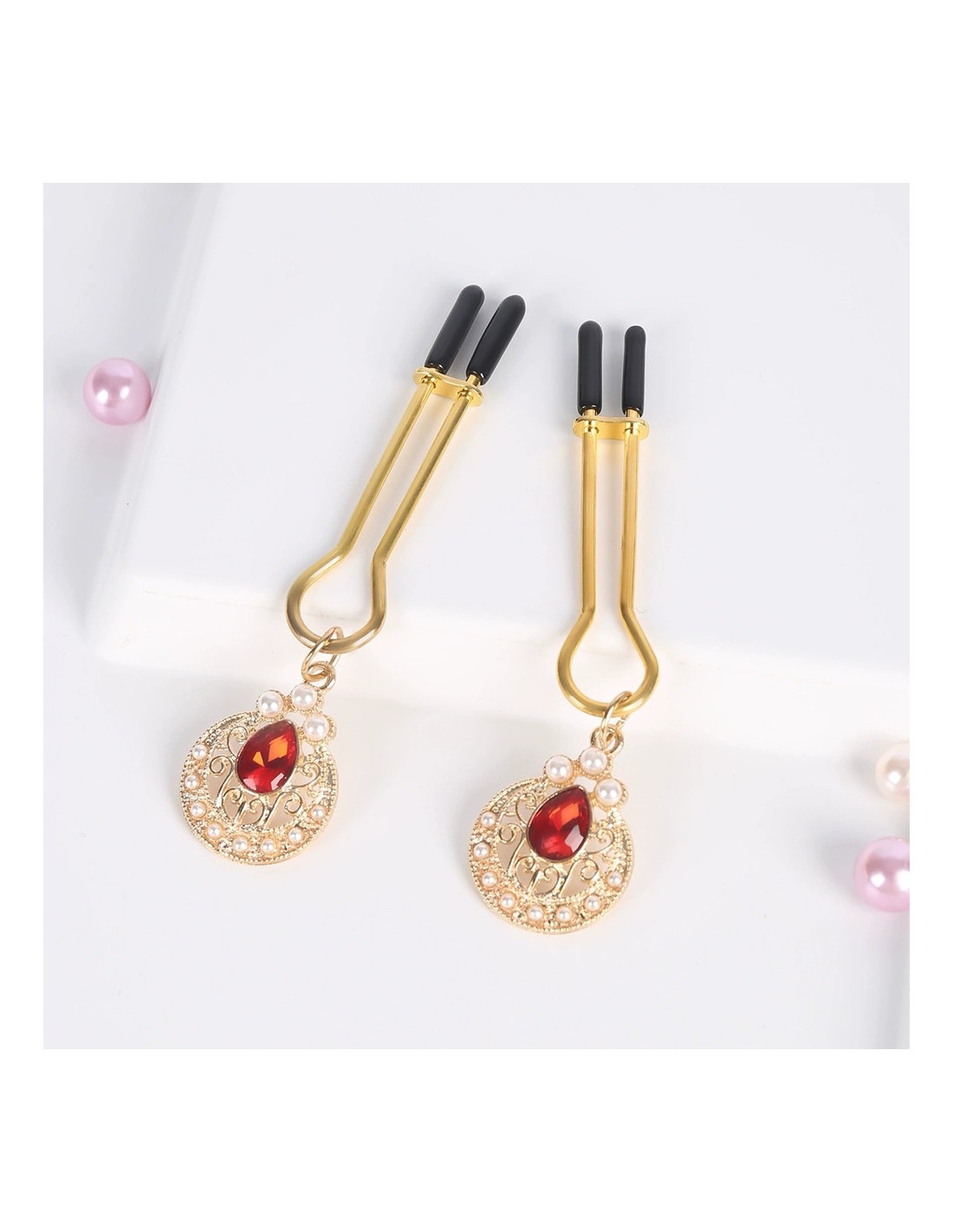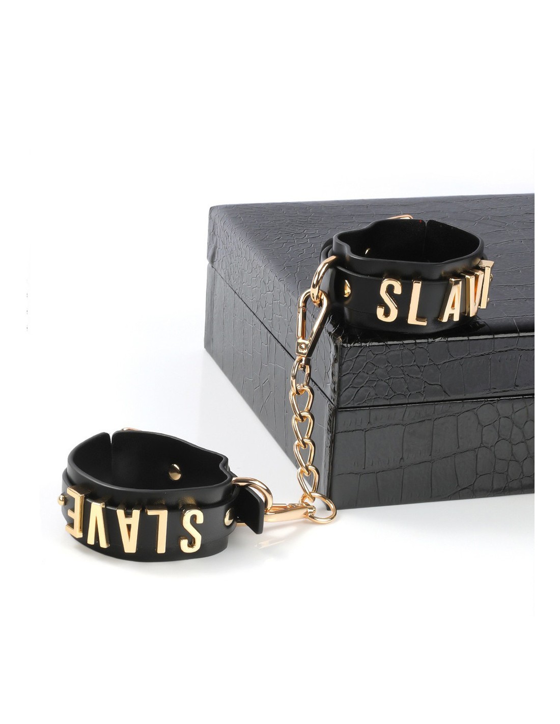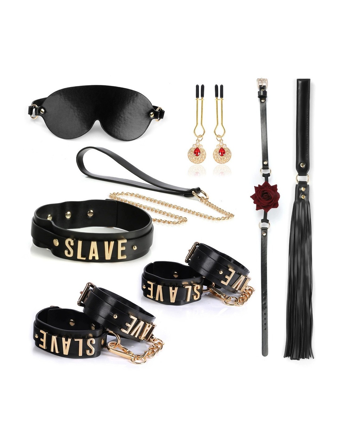Contenant :un masque totaldes pince-tétons avec une fausse pierre rougedes menottes de poignets des menottes de chevillesun martinetun bâillon-bouleet un collier-laisse