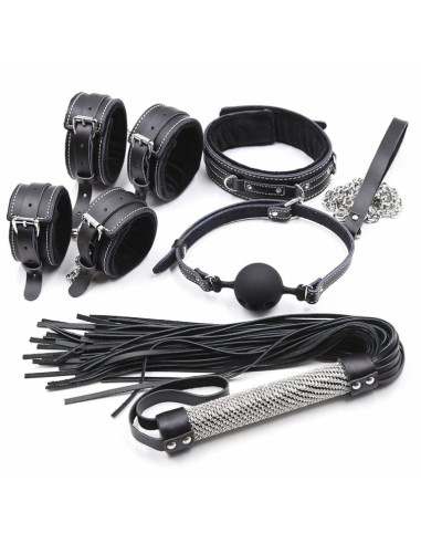 Kit avec un martinet, un bâillon-boule, un collier-laisse, des menottes de chevilles et des menottes de poignets.Matière simili et intérieur rembourré en fourrure.Avec petits strass brillant à la surface.