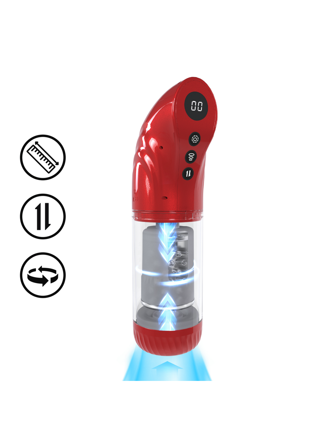 Cylindre transparent avec une longueur insérable de 17 cm.Manchon en silicone avec ouverture de 4 cm max.Intérieur avec texture.Avec 9 modes de rotation et va-et-vient. Avec 9 modes de succion.Recharge USB.