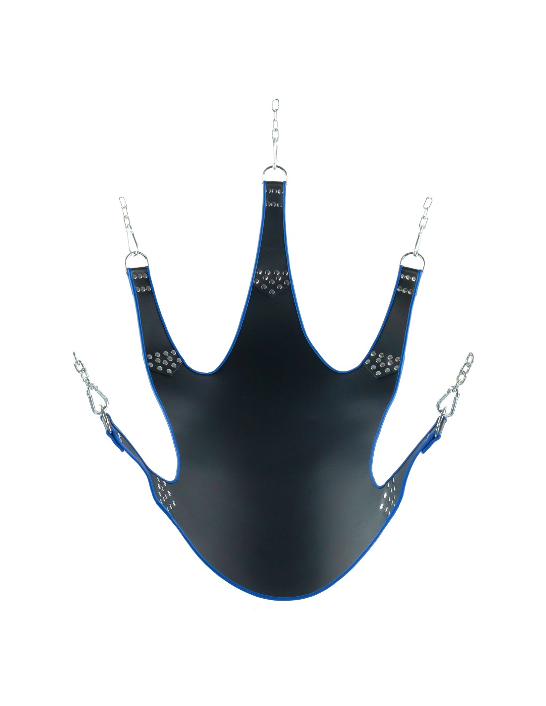 Ce sling en cuir avec 5 points d'attache est proposé sur le shop par la marque Mr Sling.Il se compose de : les dimensions 113 x 122cm l'épaisseur de 3mm les 5 anneaux en métal les bordures bleues En cuir véritable de vache. Tannage végétal.Fabriqué en Europe SLING VENDU SEUL. CHAINES ET MOUSQUETON VENDUS SÉPARÉMENT