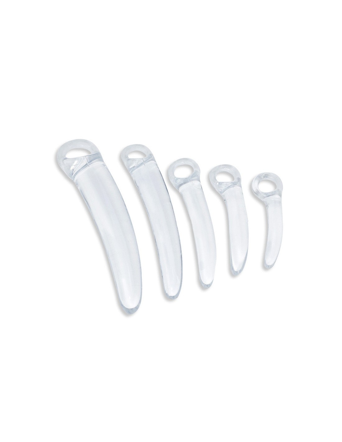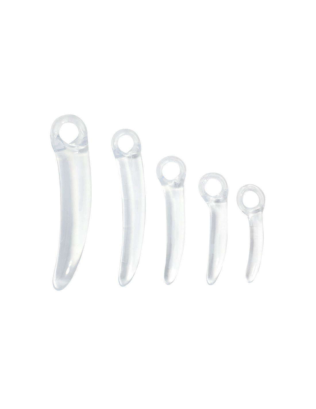 Kit de 5 plugs, à la surface lisse et à la forme courbée.Longueur insérable de 7 à 15 cm et largeur de 1 à 3.4 cm.En TPE, avec un anneau pour la prise en main.