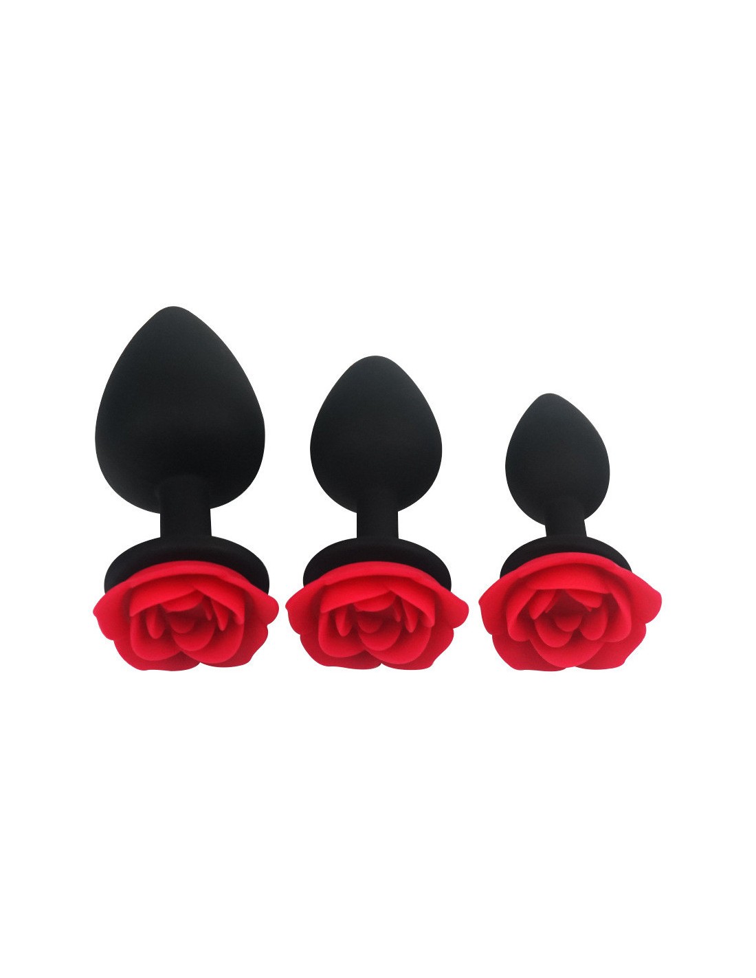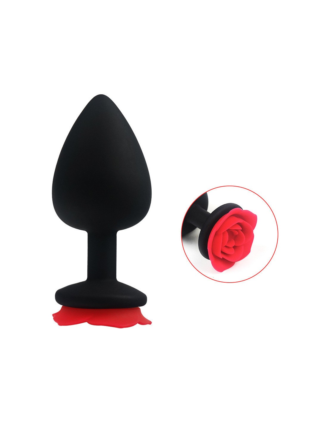 MyPlayToysPlugs coniques, de tailles différentes. Longueur de 6 à 8 cm et largeur de 2.8 à 4.4 cm. En silicone, avec base ornée d'une rose.