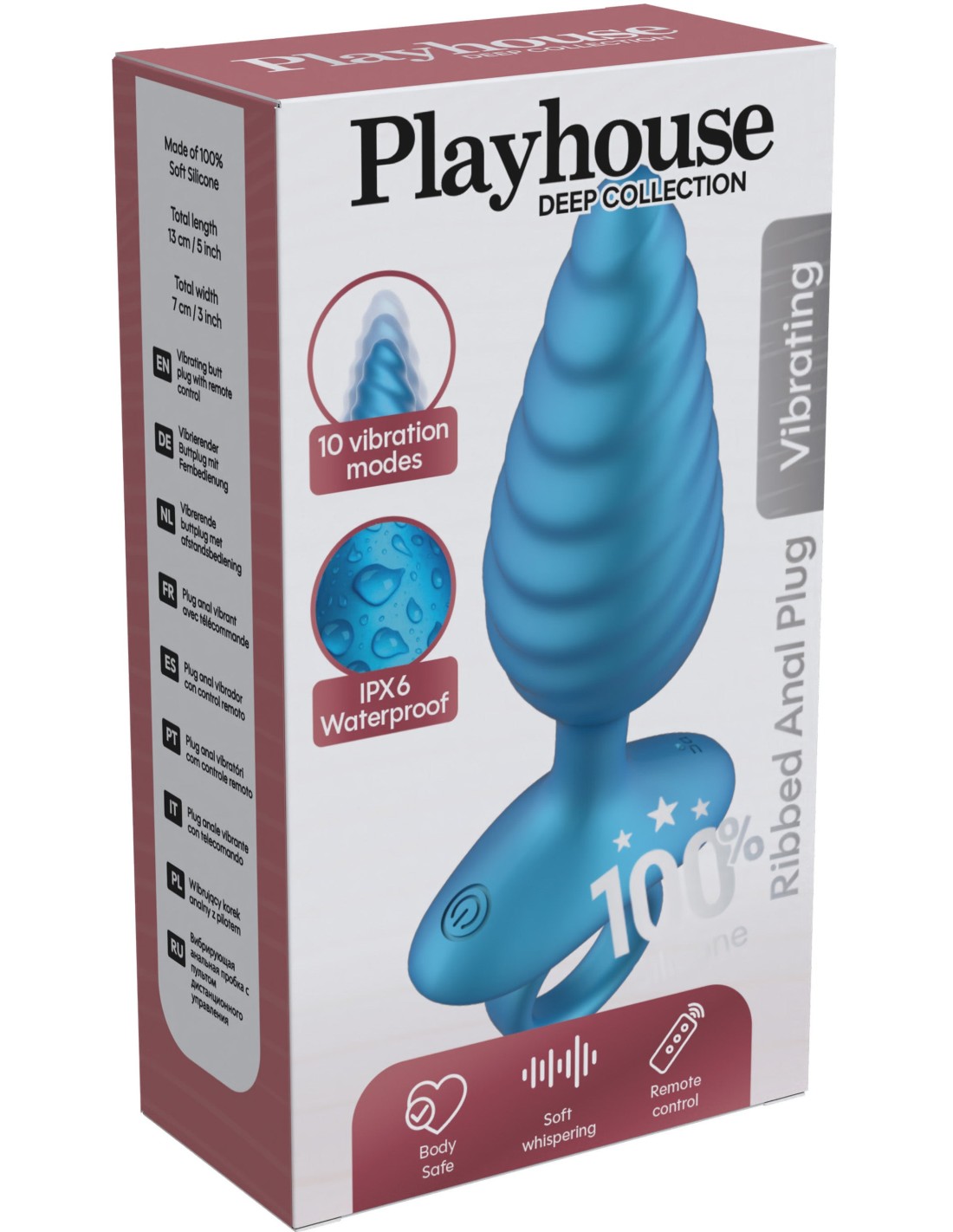 PlayHousePlug vibrant de forme conique, avec surface texturée. Longueur insérable de 10 cm et largeur de 1 à 3.5 cm. 10 modes de vibrations. En silicone, avec base large.