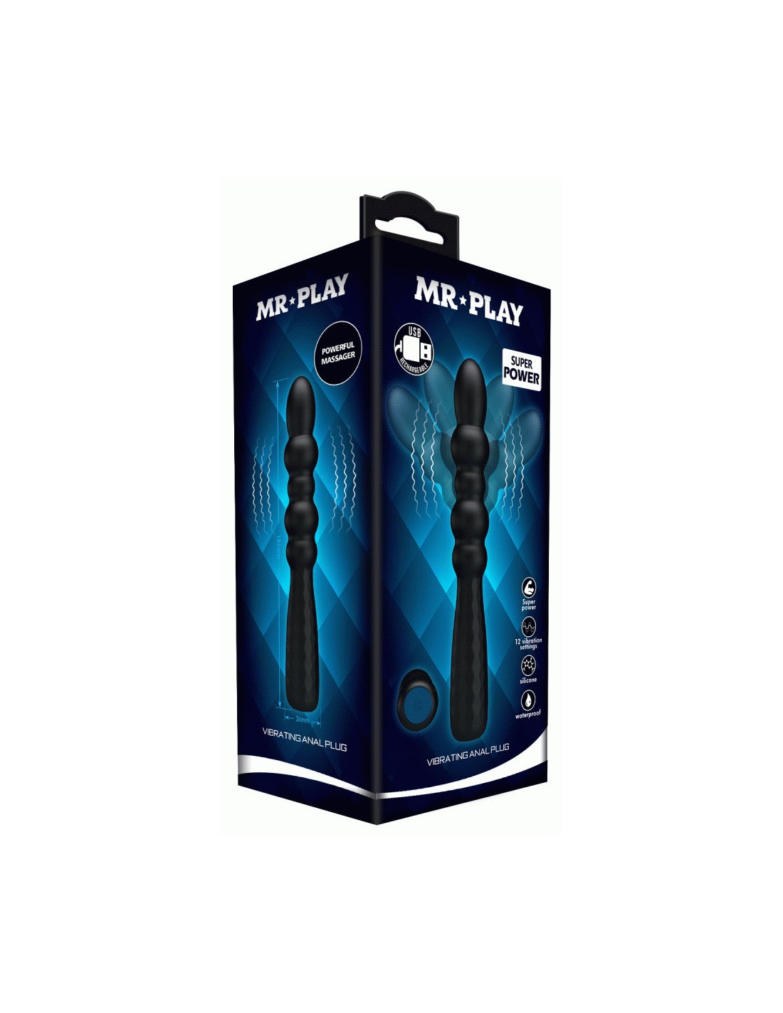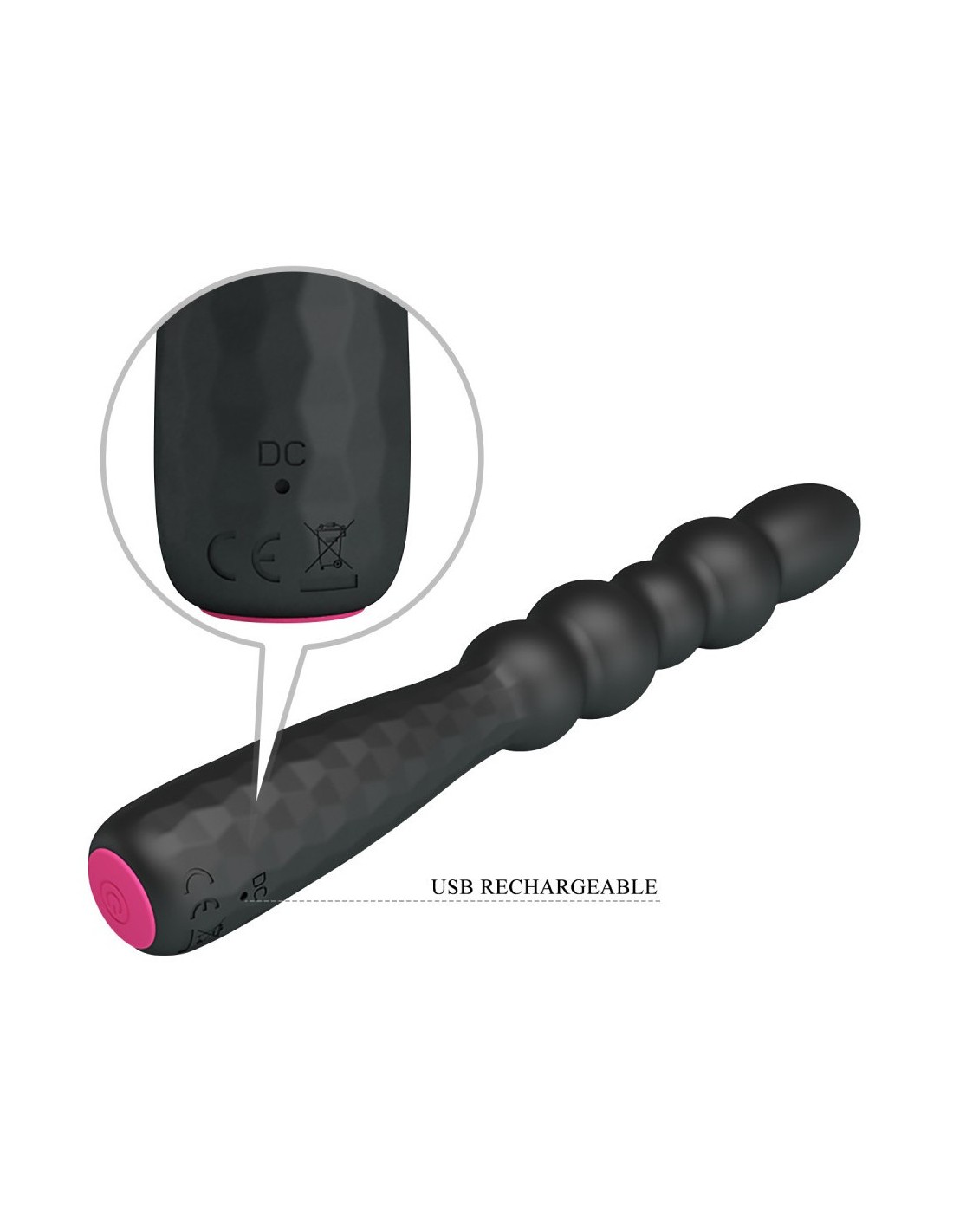Caractéristiques :Longueur totale 18 cm Longueur insérable 10 cmLargeur mini 2 cmLargeur maxi 2.5 cm12 modes de vibrations Rechargeable - batterie lithiumÉtanche, pas d'immersion Poids 80 grammesConseils d'utilisation : le nettoyer avant et après chaque utilisation avec de l'eau savonneuse tiède et le laisser sécher à l'air librel'utiliser, uniquement, avec du lubrifiant à base d'eau le conserver dans un endroit sec et propre, à l'abri de la lumière et de la chaleur, sans contact avec d'autres objets