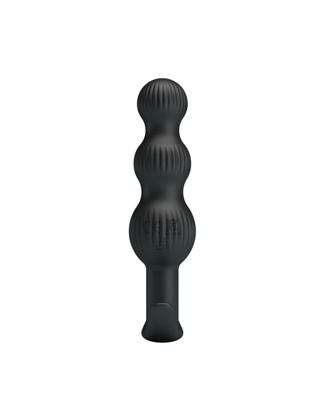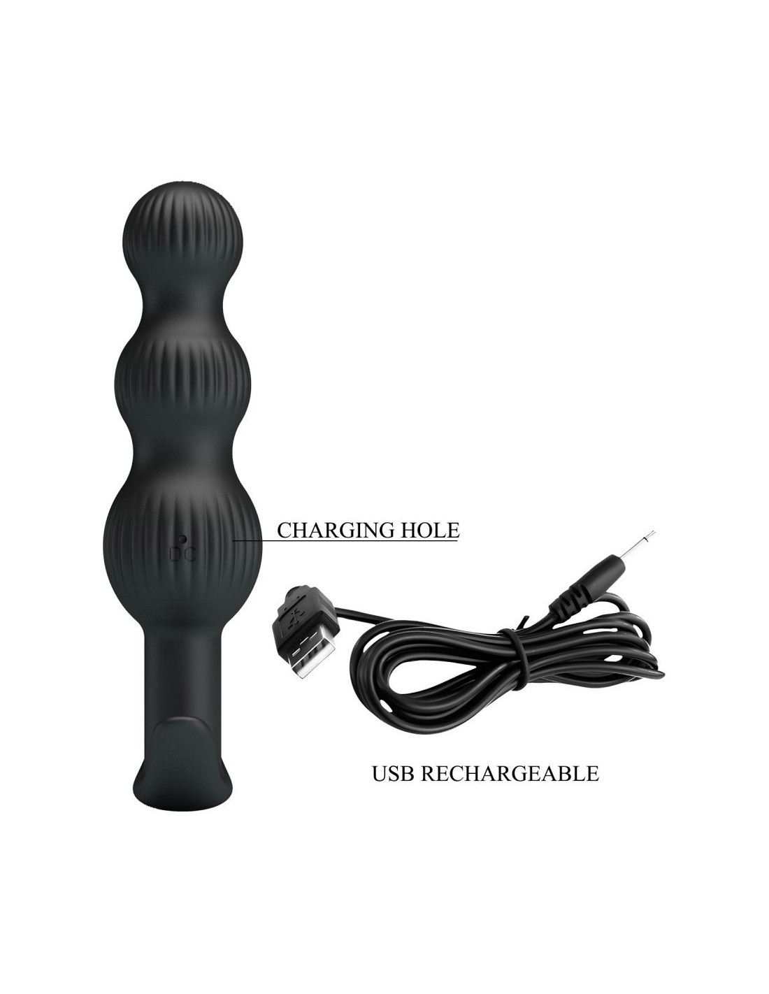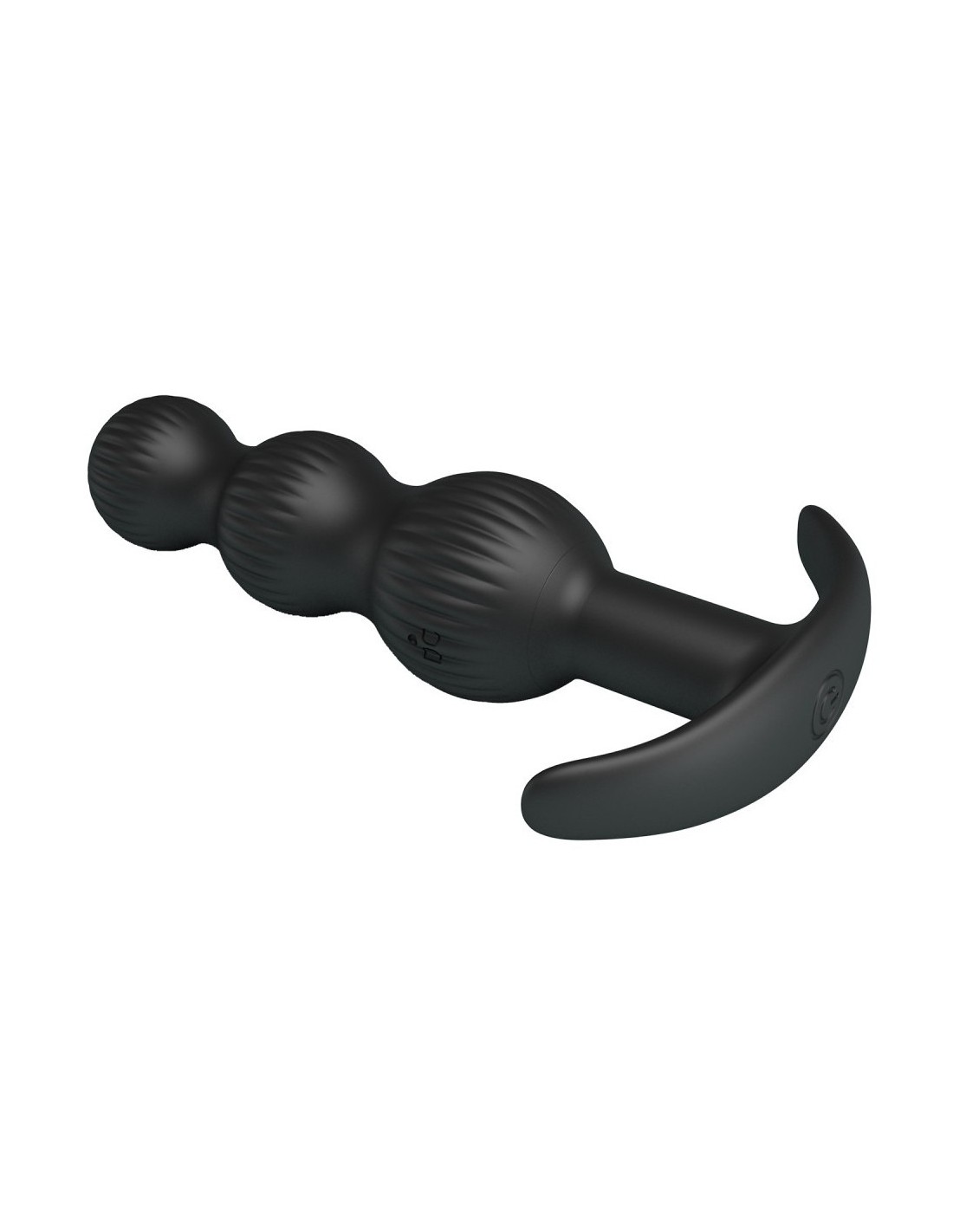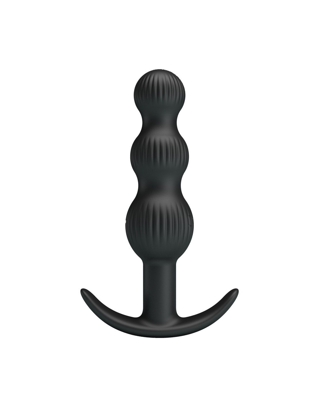 Pretty LovePlug de 3 boules de taille progressive.Longueur insérable de 10 cm et largeur de 2 à 2.7 cm. 10 modes de vibrations, rechargeable.En silicone, avec base large.
