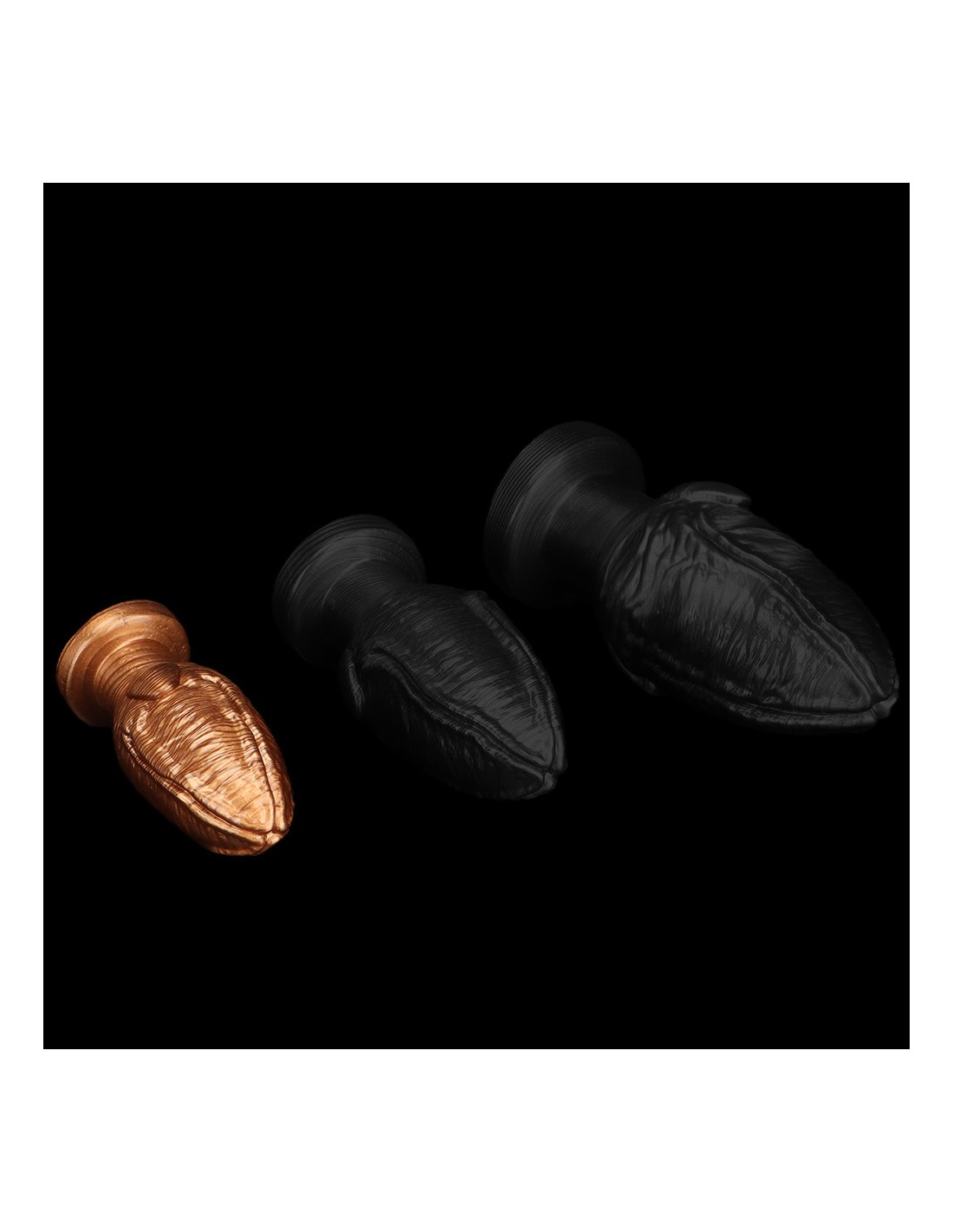 MetallicAnalPlug à la forme originale avec surface texturée.Longueur insérable de 11 cm et largeur de 3 à 6 cm. En PVC, avec base plate (non ventousée).