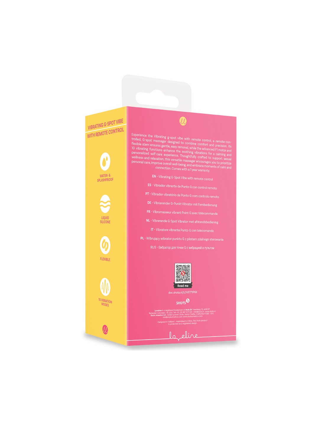 LovelineStimulateur point G vibrant, étanche et rechargeable.Longueur insérable de 10 cm et largeur de 3 à 3.5 cm.10 modes de vibrations.En silicone.