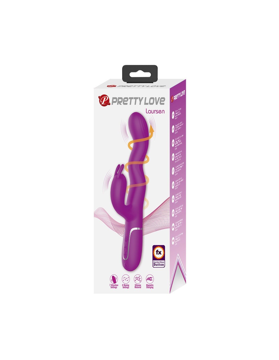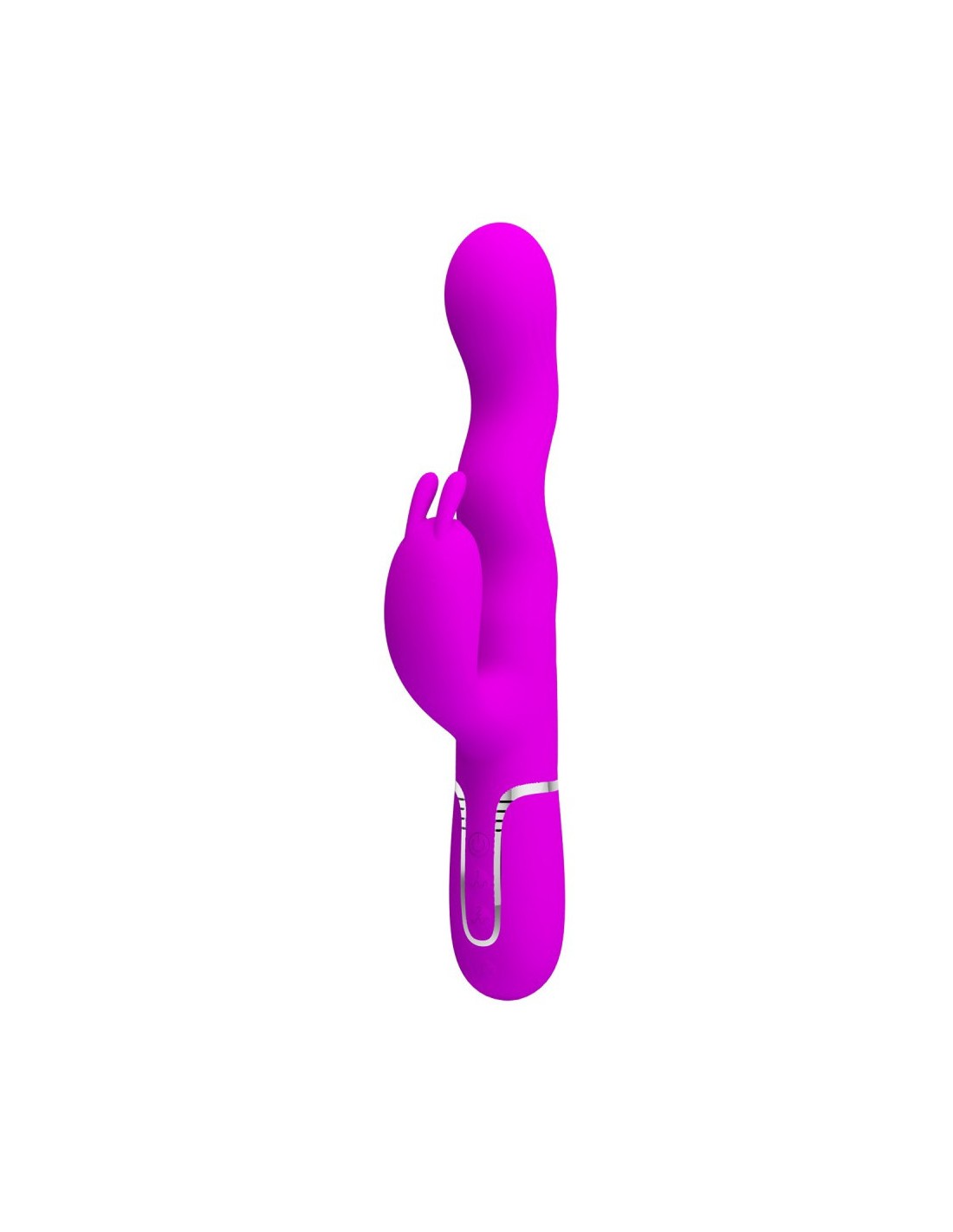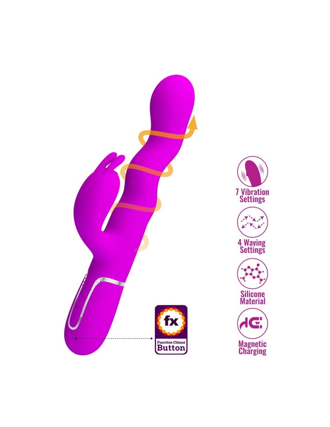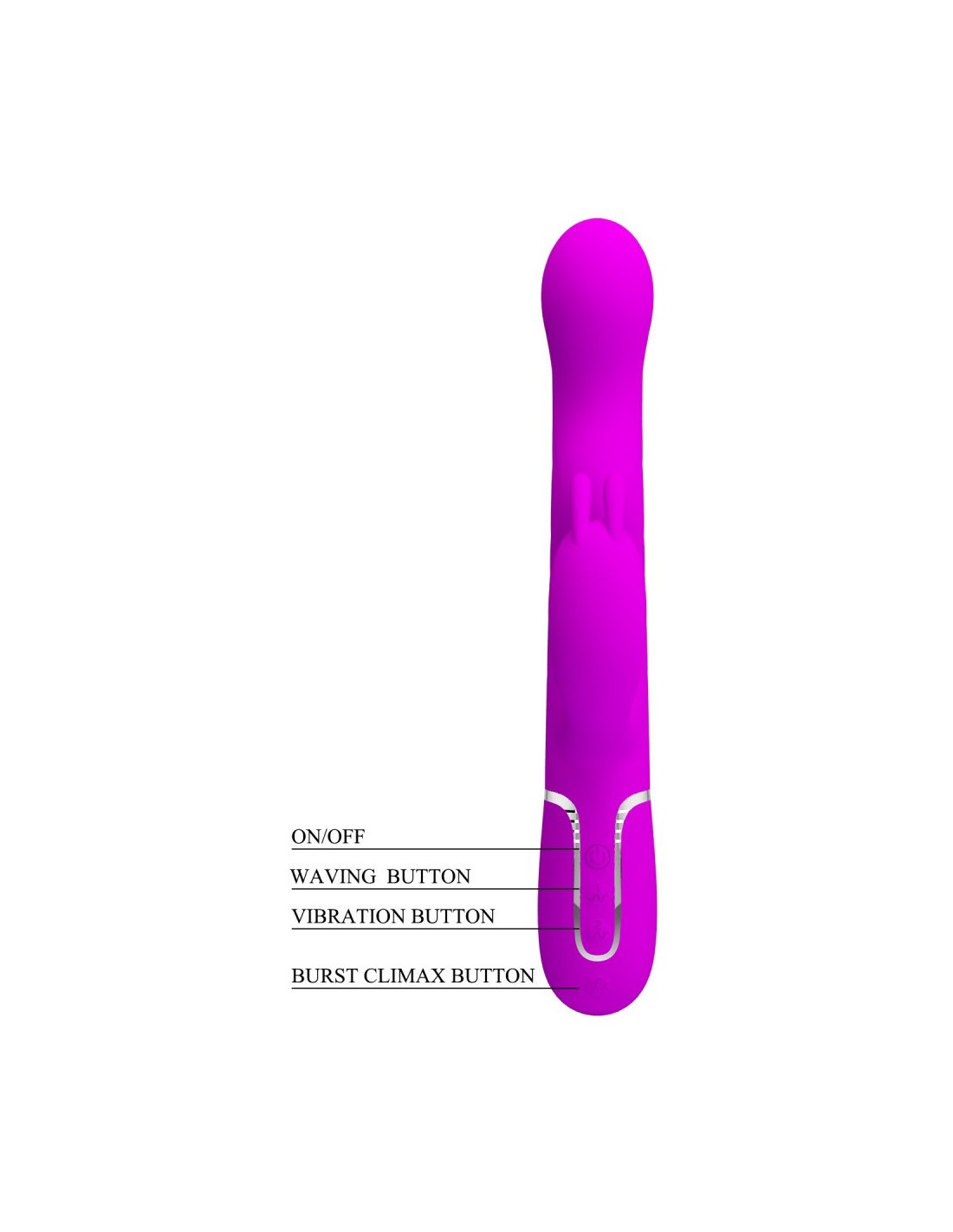 Pretty LoveVibro rabbit avec 7 vibrations et 4 mouvements de vagues.Longueur insérable de 14 cm et largeur de 2.7 à 3.7 cm.En silicone, rechargeable.