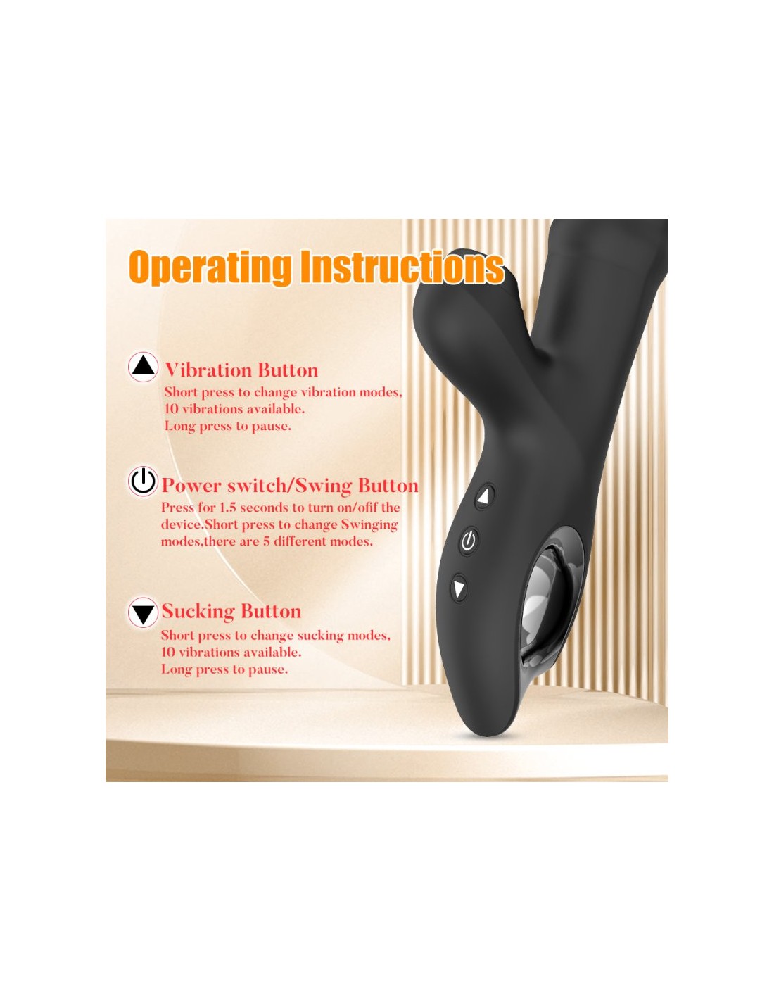 Conseils d'utilisation :le nettoyer avant et aprèsl'utiliser, uniquement, avec un lubrifiant à base d'eaule conserver à l'abri de la lumière et de la chaleur, dans un endroit sec et propre, sans contact avec d'autres objetsCaractéristiques :longueur totale 25 cmlongueur insérable 14 cmlargeur 3.2 à 3.5 cmrechargeable — batterie lithium10 vibrations 10 aspirations5 mouvementsétanche